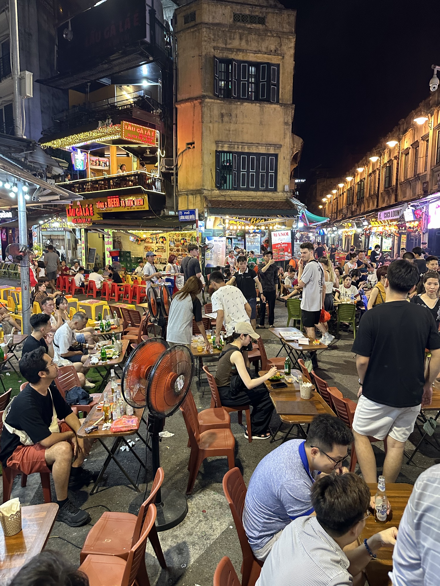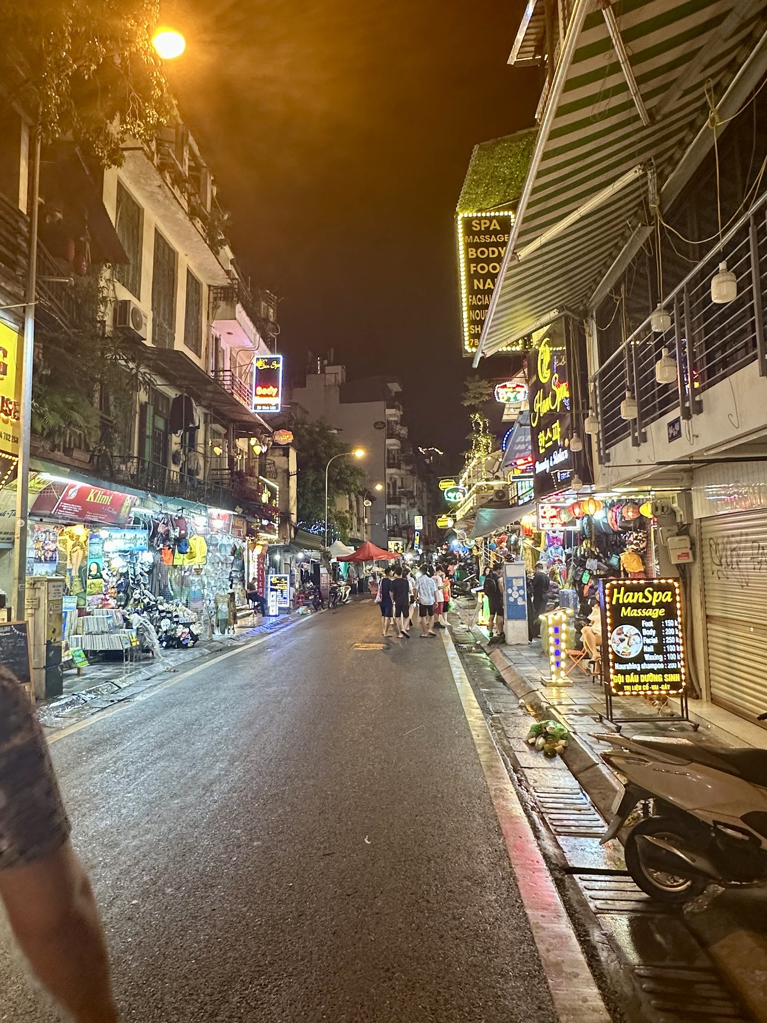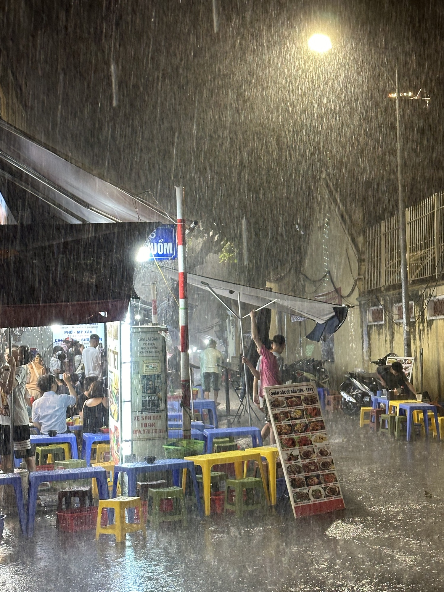 After dinner, we took a Grab to the Old Quarter to meet up with the rest of our tour group. While waiting, Andrew and I explored the weekend night market, amazed at how narrow streets transformed into a smorgasbord of restaurants, shops, and beer gardens, with aggressive sales staff trying to lure us in. A few drops of water led us to believe it was AirCon runoff, but we soon found ourselves in a downpour. We dashed to a corner awning, sheltering with about 20 others, just as tree branches crashed down where we had been. Once the rain let up, we headed to a rooftop bar where our friends joined us for drinks to close out the night. We then took a van Grab back to the hotel for some rest before our early start the next day.
