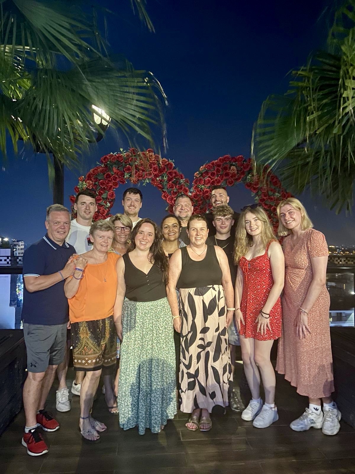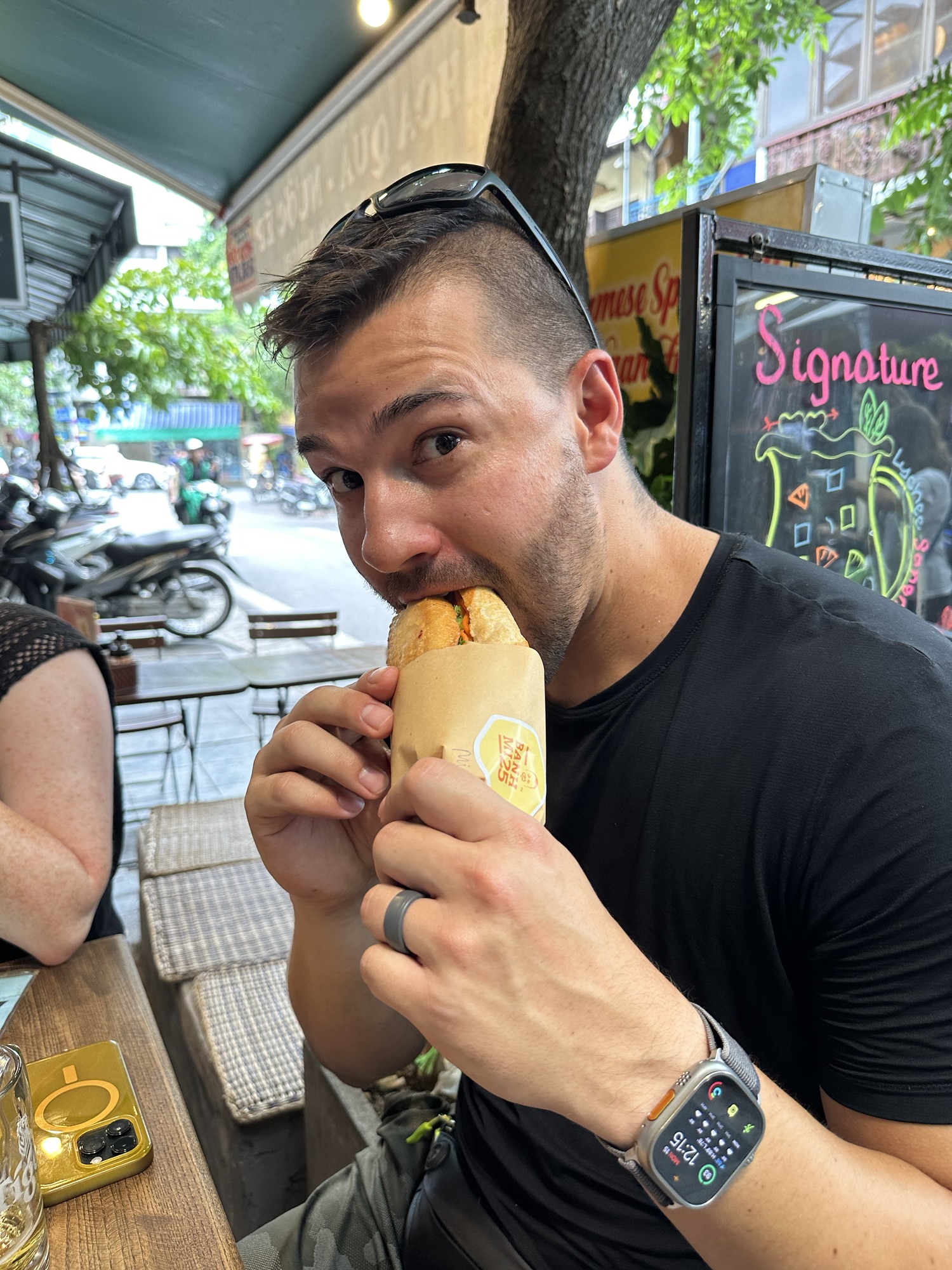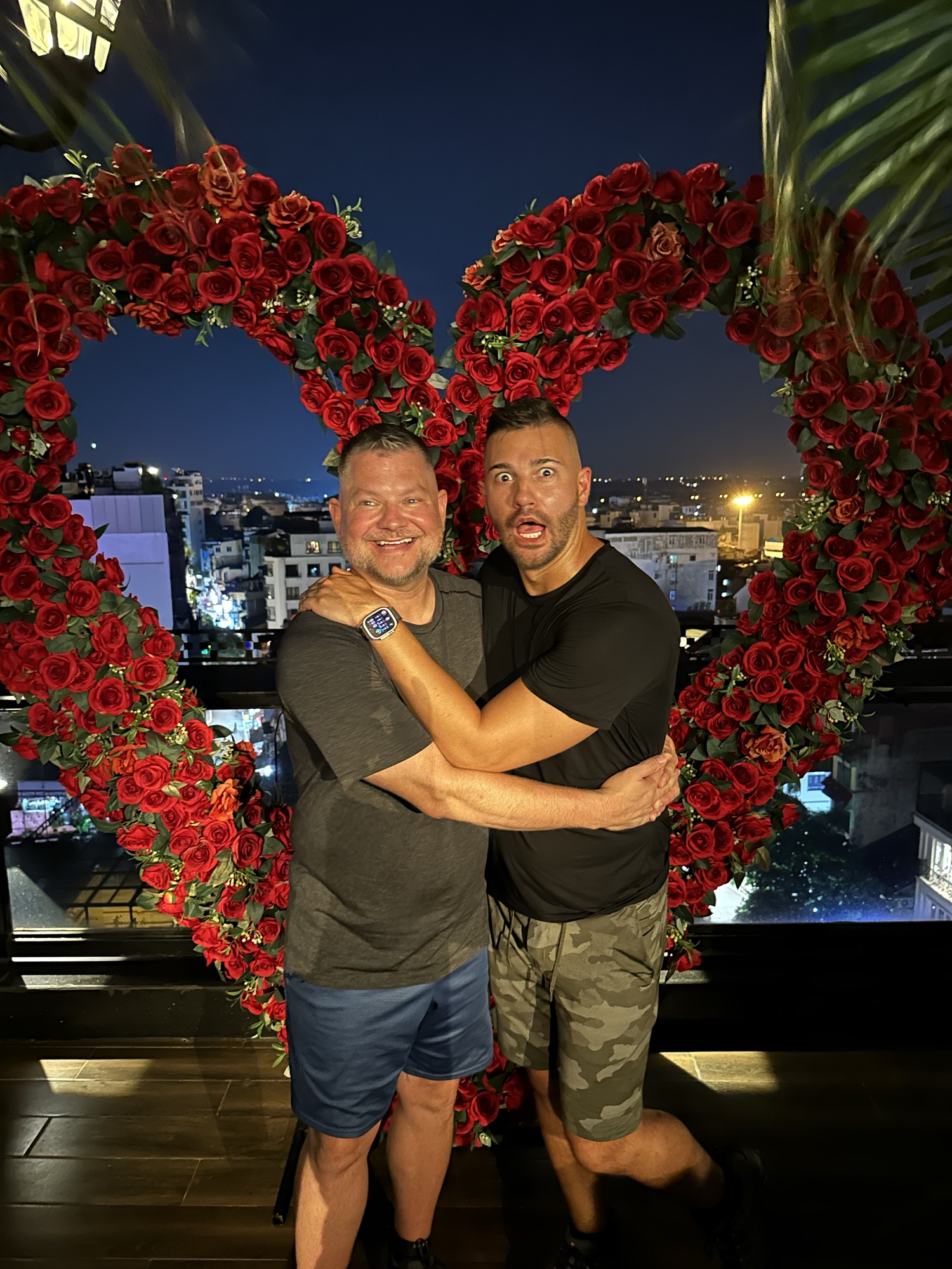 After dinner, we took a Grab to the Old Quarter to meet up with the rest of our tour group. While waiting, Andrew and I explored the weekend night market, amazed at how narrow streets transformed into a smorgasbord of restaurants, shops, and beer gardens, with aggressive sales staff trying to lure us in. A few drops of water led us to believe it was AirCon runoff, but we soon found ourselves in a downpour. We dashed to a corner awning, sheltering with about 20 others, just as tree branches crashed down where we had been. Once the rain let up, we headed to a rooftop bar where our friends joined us for drinks to close out the night. We then took a van Grab back to the hotel for some rest before our early start the next day.
