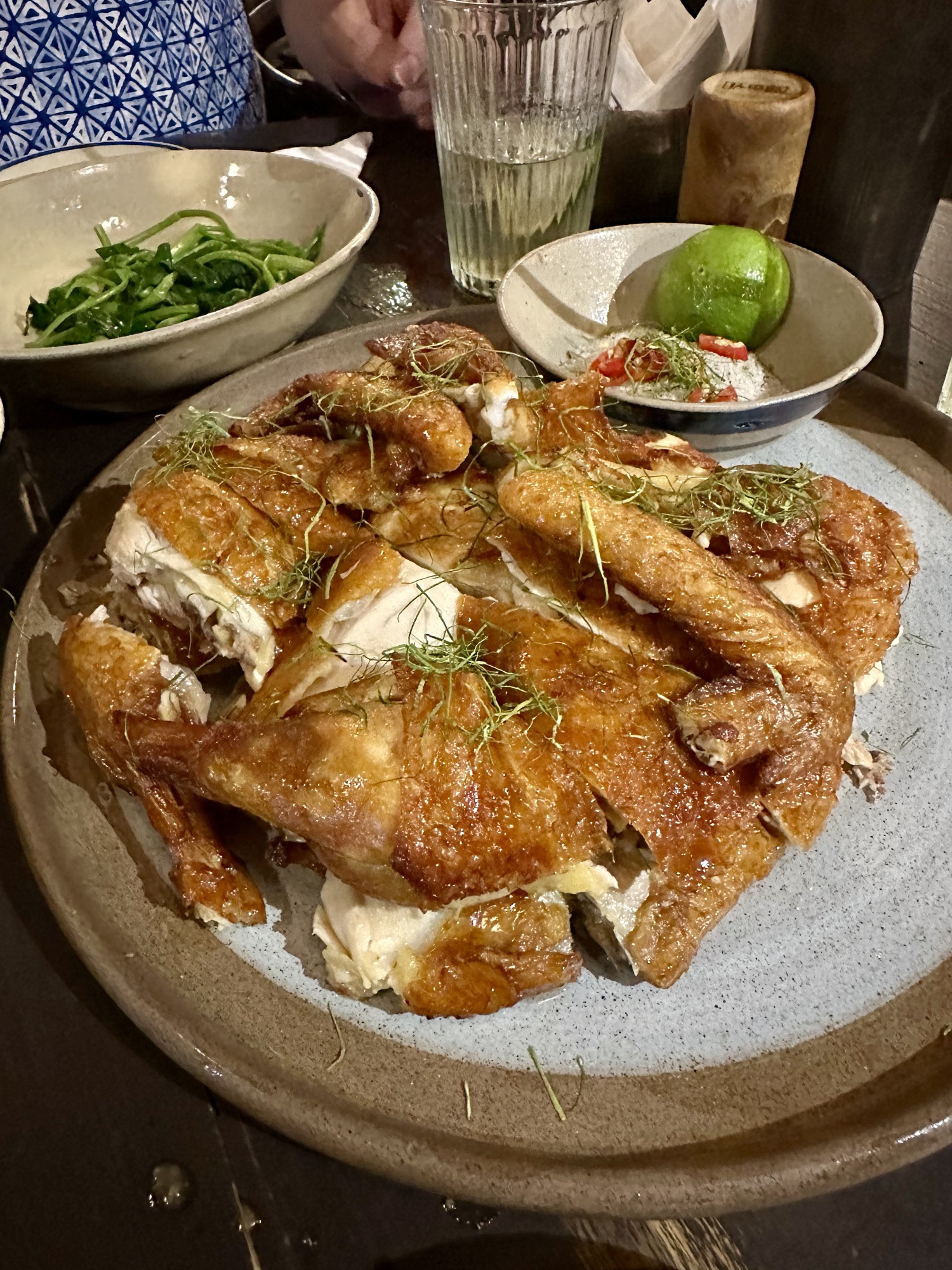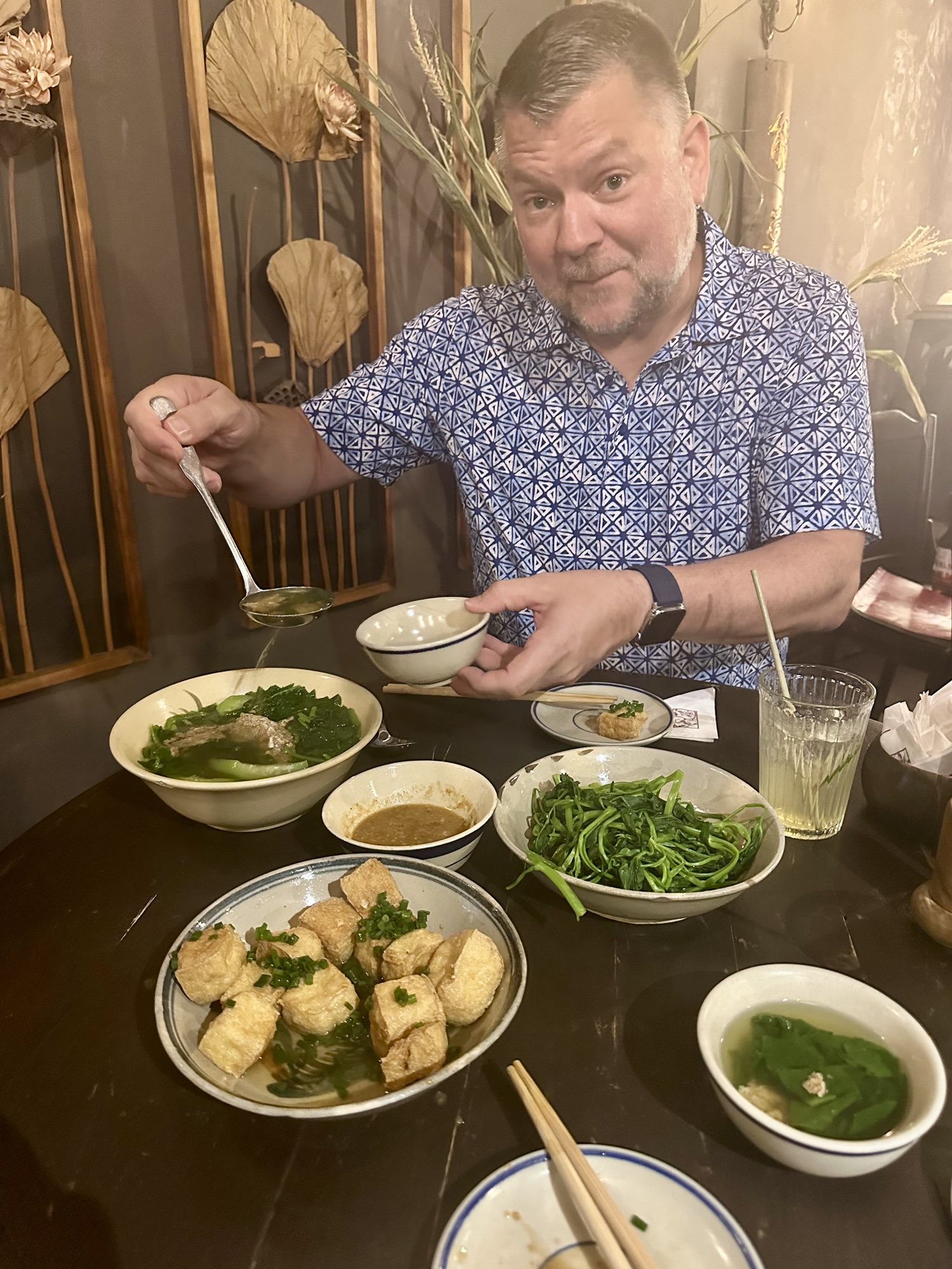 After clearing customs, we caught a bus to our hotel. During trip planning, I found out that several countries we were visiting had Michelin-starred restaurants. Tonight, we were visiting our first one. Customs delays meant we only had a quick freshen-up at the hotel before Andrew and I got a Grab (their equivalent of Uber) to ride to Tam Vi for dinner. Tam Vi is one of six Michelin-starred restaurants in Vietnam, with three in Hanoi and three in Ho Chi Minh City. We enjoyed our meal, though a single star in Asia seemed different than in the U.S. Our dinner consisted of four dishes and three non-alcoholic drinks for $33. The crispy tofu with green onion sauce was the best tofu I’ve ever had, and we loved the steamed morning glory served with a delicious soybean paste. The roasted chicken and soup were just okay. But, another Michelin restaurant checked off the list!