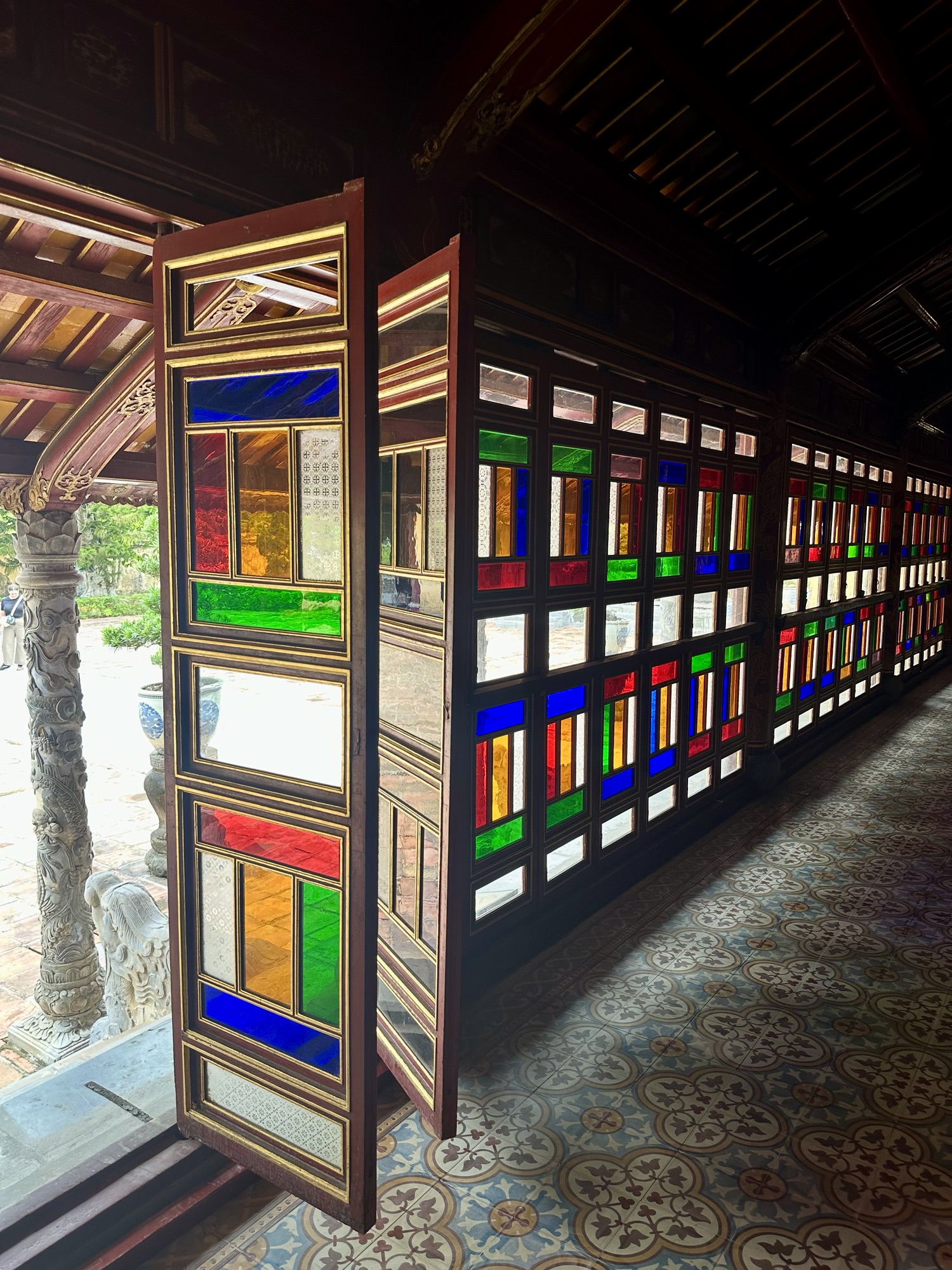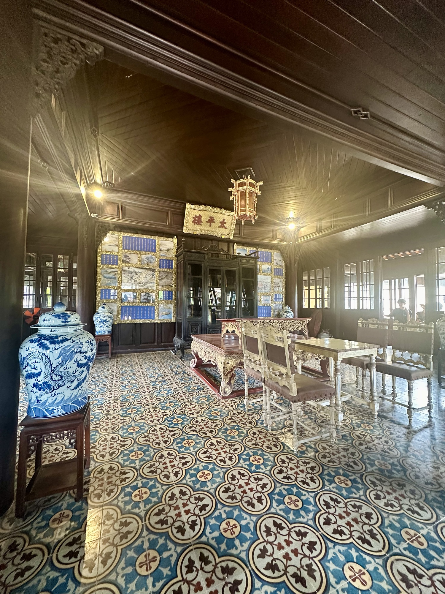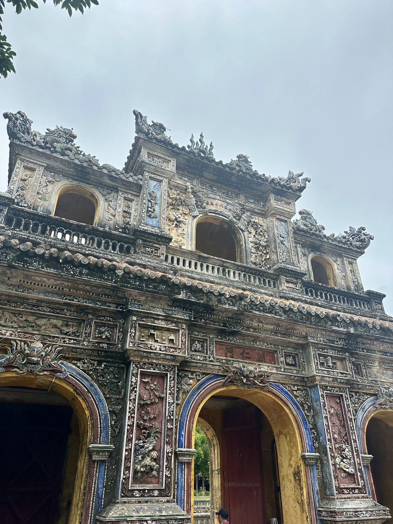 After collecting ourselves, we proceeded to the Imperial Tomb of Dong Khanh. This gorgeous structure held not only the emperor’s tomb but also the quarters he once inhabited. Many emperors assisted in building this site since Dong Khanh passed away at 25 without constructing a tomb for himself. The war damaged parts of the site, which have since been repaired with the help of UNESCO. There is a lot of history to this site so I’ll let a link here so you can read more about it if you’d like.