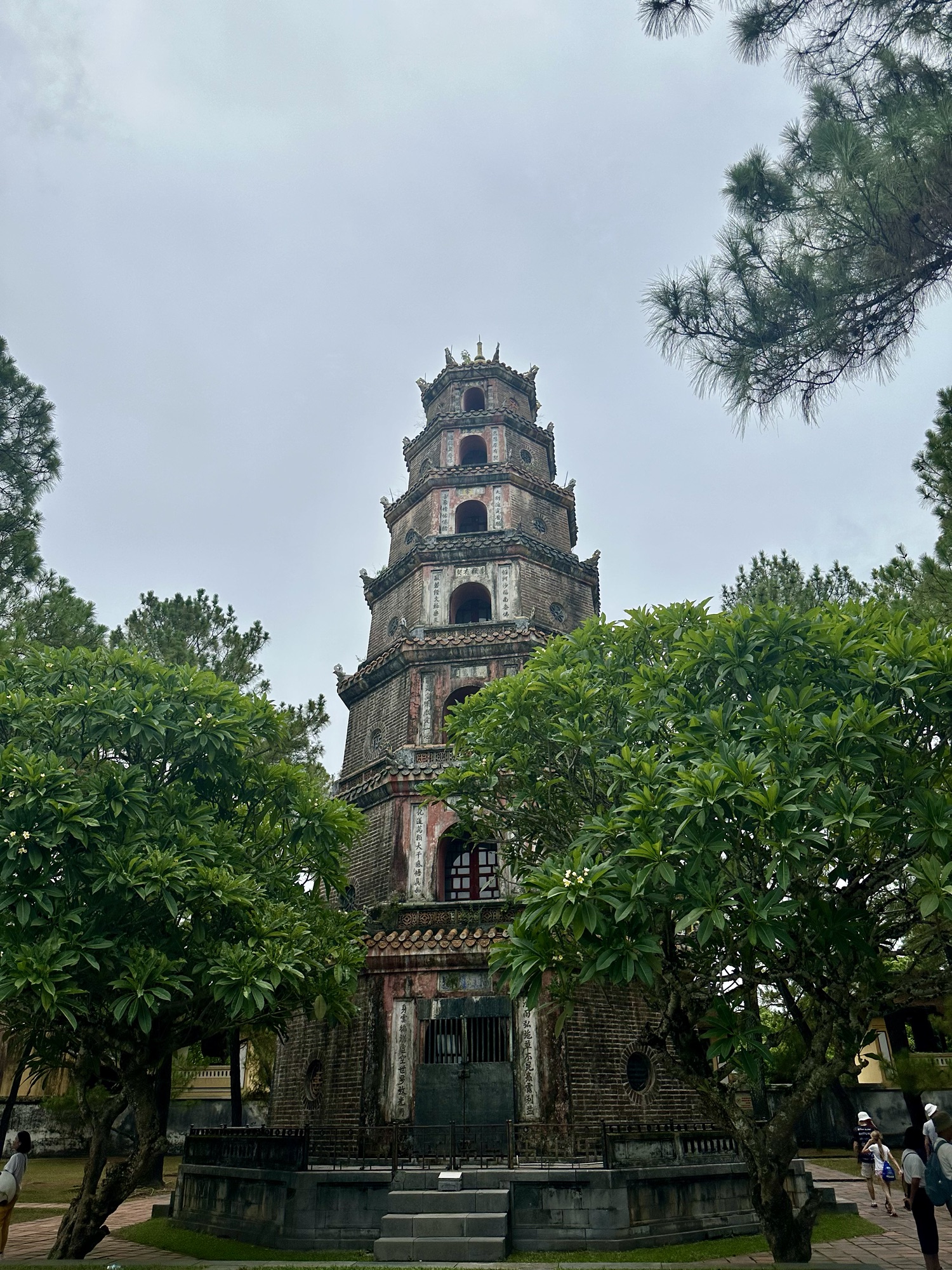 Winding through gardens and relics, the group learned from Phuong about the various parts of the city and their historical uses. At one point, Phuong picked up a small bullet from an M16 that had surfaced after recent heavy rains. He explained that relics such as bullets and fabrics are still left to be found all over Huế. After a brief break for water, fans, and beers, the group got back on the bus to head to our next historical site, the Thien Mu Pagoda.