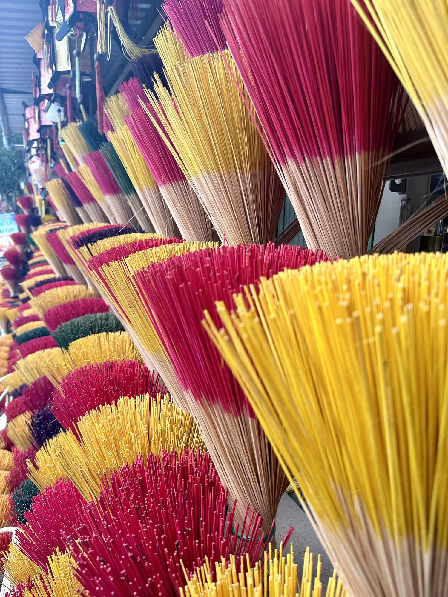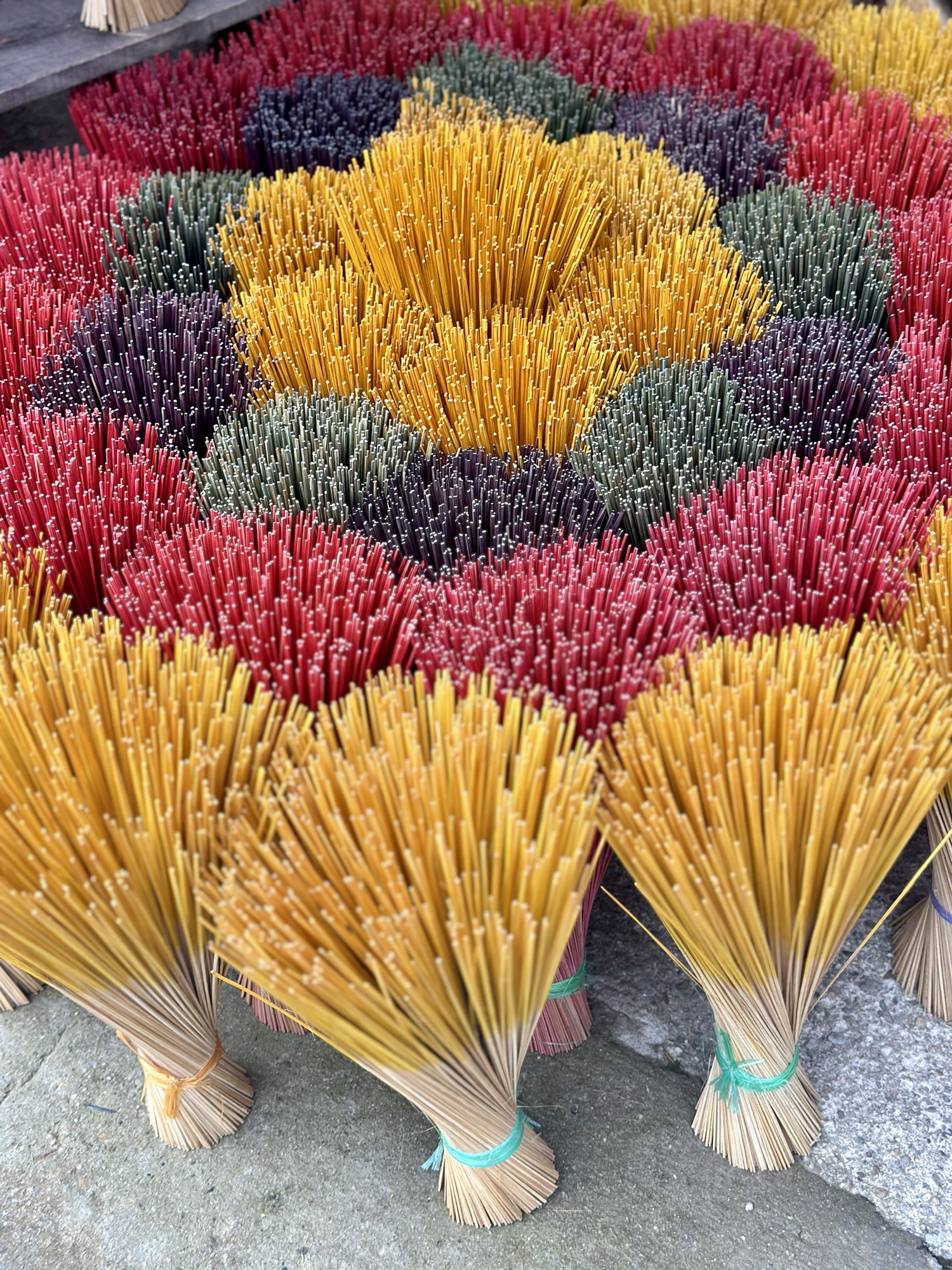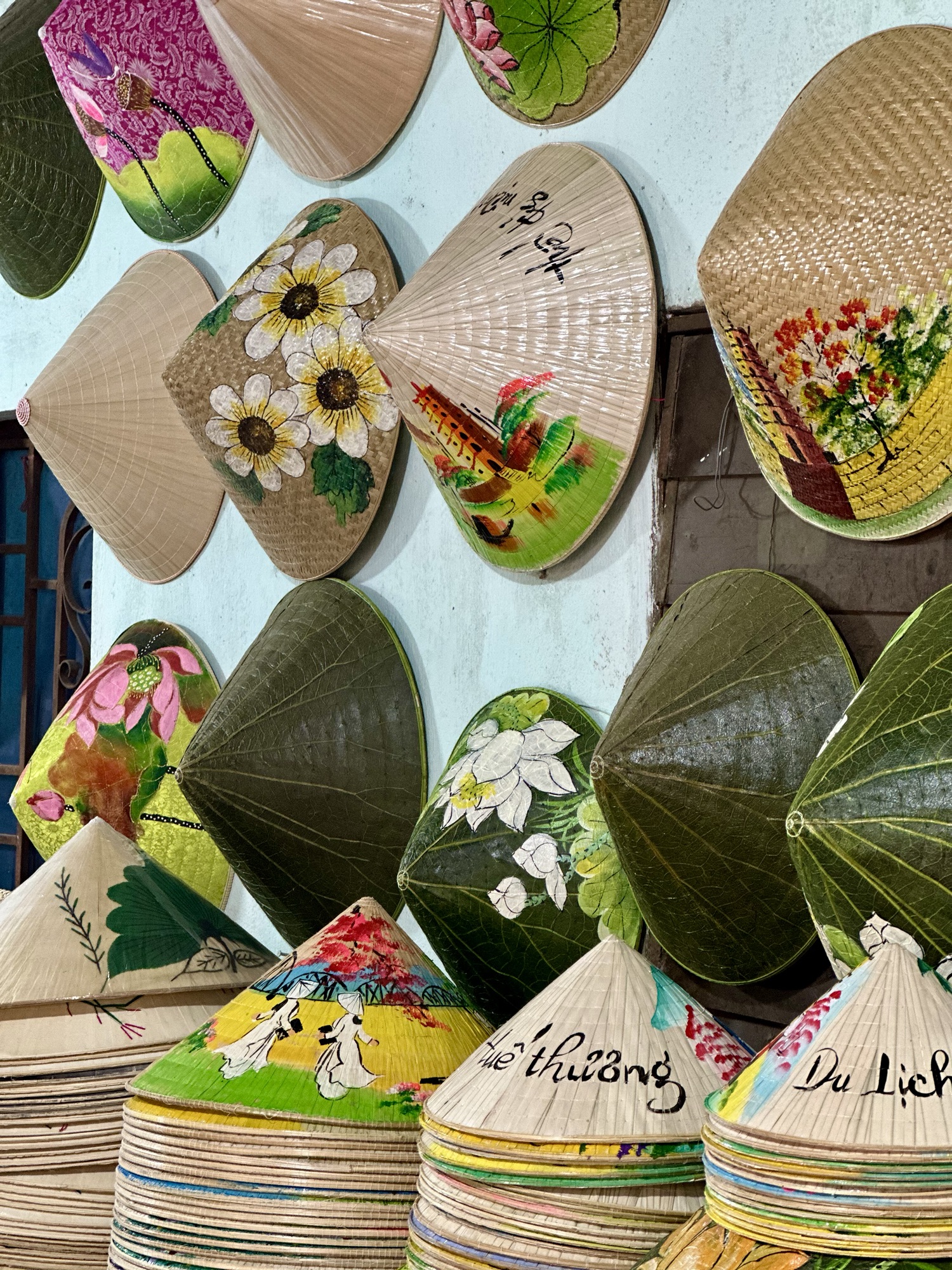 Our second stop, after a breezy trip through village alleys and dirt roads, was Incense Village. This was a nostalgic sight for me as the smell of incense reminded me of my childhood. We saw a local villager demonstrate making lemongrass incense; she produces over 2,000 sticks daily. The men cut strips of wood and dye them in various colors to match the given fragrance. The sticks are then dried in a beautiful arrangement before being used by the incense makers. The process, captured in my compliation video, showed the villager combining fragrance with putty, rolling it onto the stick, and then rolling it into sawdust, which is dried by the sun before packaging. We also saw traditional straw hats being made and sipped local tea with dried and sugared ginger. Phuong mentioned his parents have this tea and ginger daily, attributing their health to this practice.