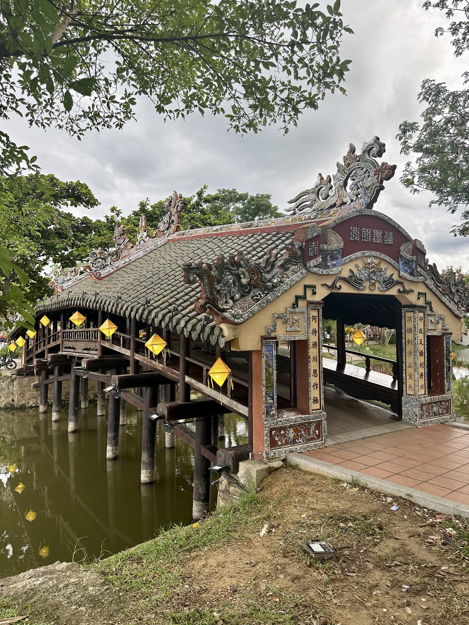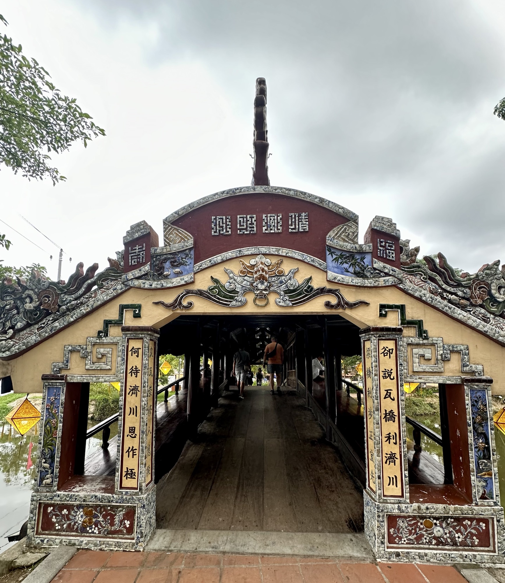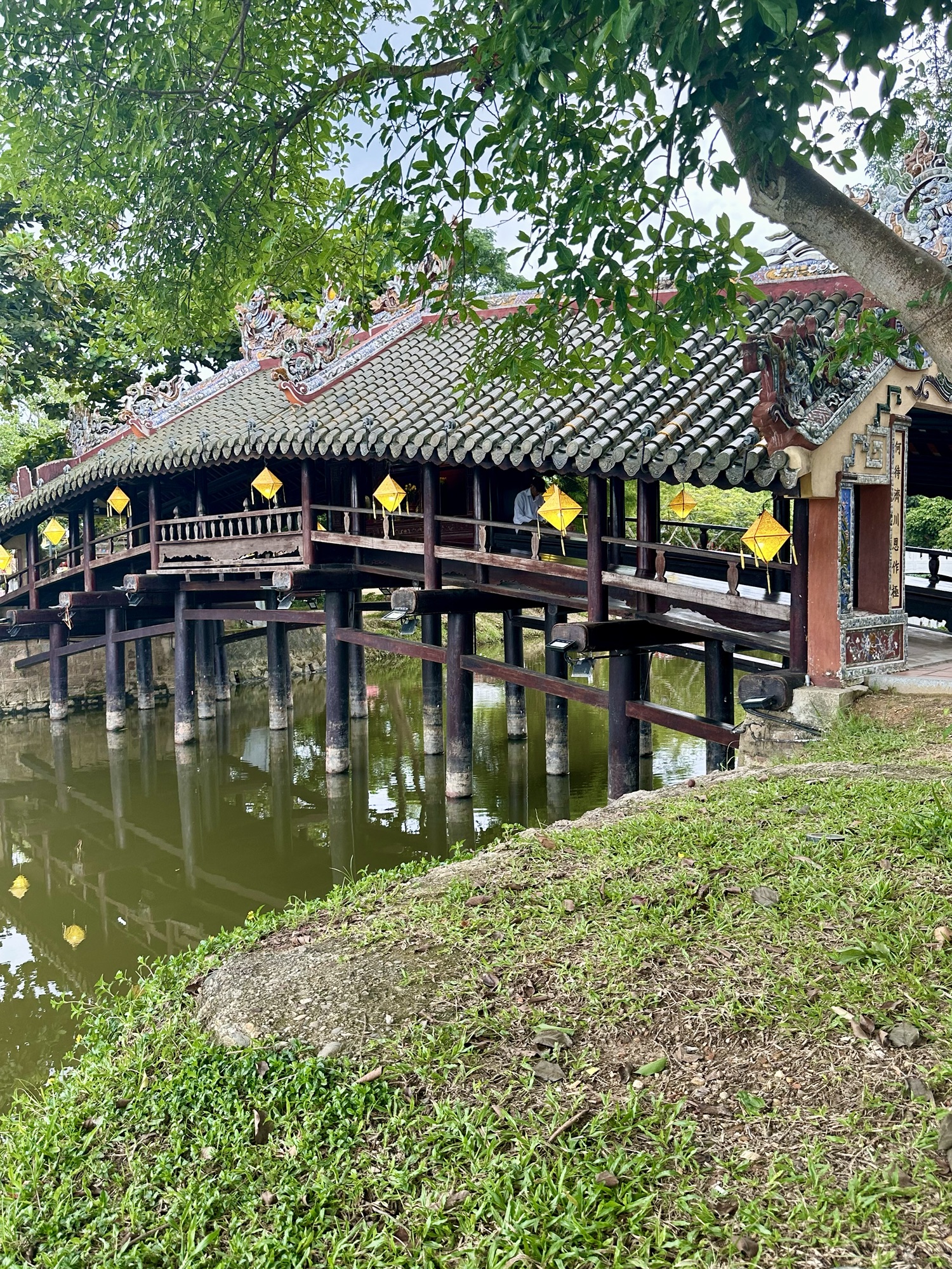 Our last stop took us 40 minutes out of the city into the rural countryside, passing fields of tapioca and rice as well as duck and pig farms. The rice museum was opened just for us. Phuong demonstrated how water irrigation was done before the advent of machines. An elderly woman then demonstrated harvesting rice, which was milled, sifted, pounded, and ground into rice flour—all captured in a compilation video I made. A quick walk outside the museum led us to The Vestige of Thanh Toan Tile-Roofed Bridge. This stunning wooden bridge, constructed in 1776, was central to local gossip and worship of Ms. Tran Thi Dao, a well-regarded local who funded its construction and other efforts to better the people of Huế.