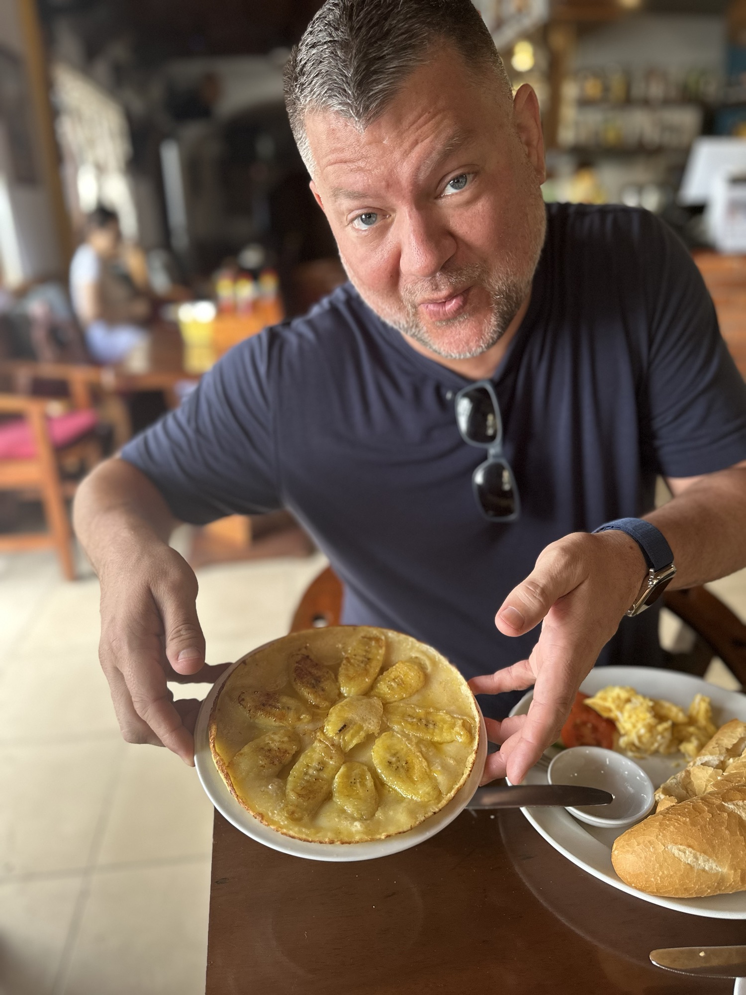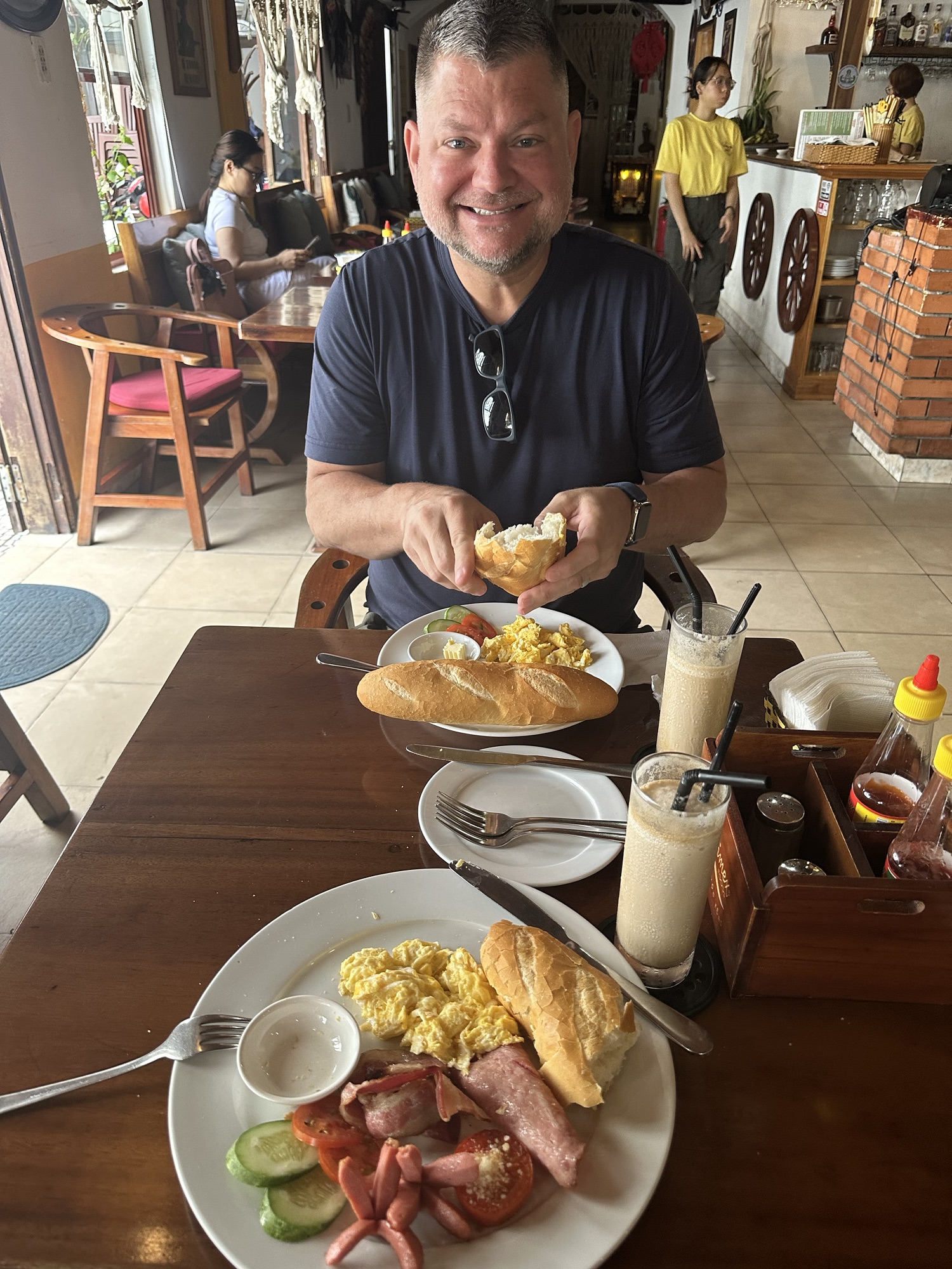 Waking up refreshed, we enjoyed more coconut coffee, which has become our go-to drink, along with eggs, bread rolls, a banana pancake, and more. It was a nice break from Asian breakfast, returning to something more familiar. Now, we’re back on the bus, heading three hours to Hoi An, where we’ll spend the next three nights. We’re looking forward to doing laundry, unpacking, and having a lighter schedule with optional activities.