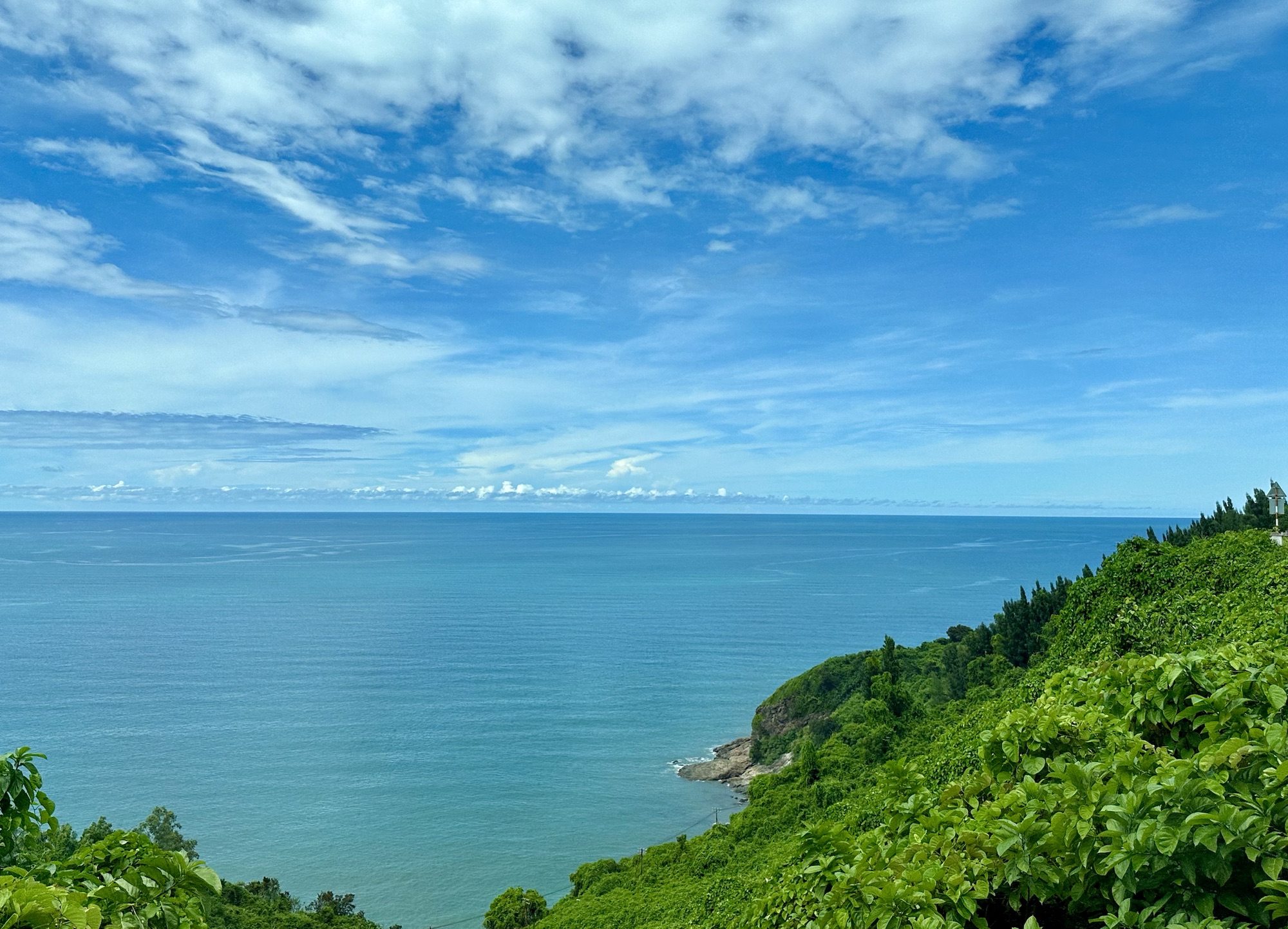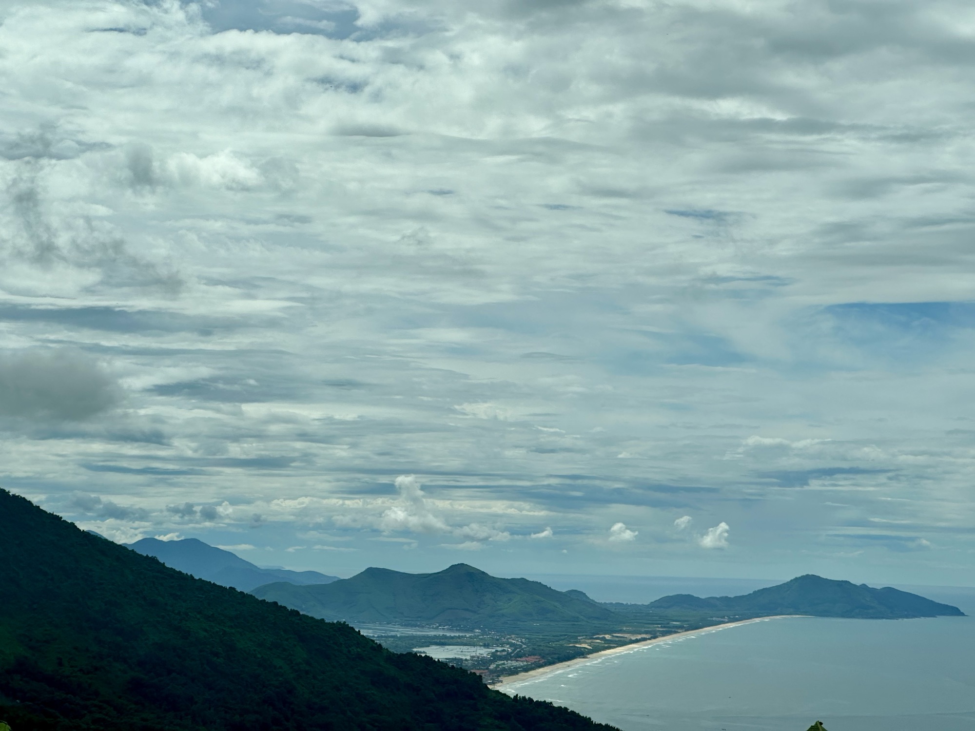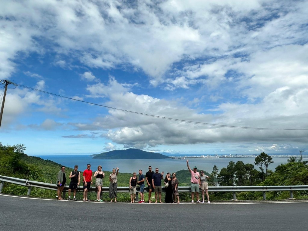 Leaving Hue by bus, we were in for quite a treat for our eyes. Expansive vistas greeted us as we zigged and zagged up the mountains. Our CEO/guide, Puna, pointed out the famous Lang Co Beach, which is the longest stretching beach in Vietnam and one of the prettiest. If you look it up, you will see why it got that title and why many in Vietnam and Southeast Asia vacation there. As we continued to climb the winding mountain, we asked if the bus driver could pull over for us to take a photo, and he thankfully obliged. Below, you will see the gorgeous group photo Puna took of us all.