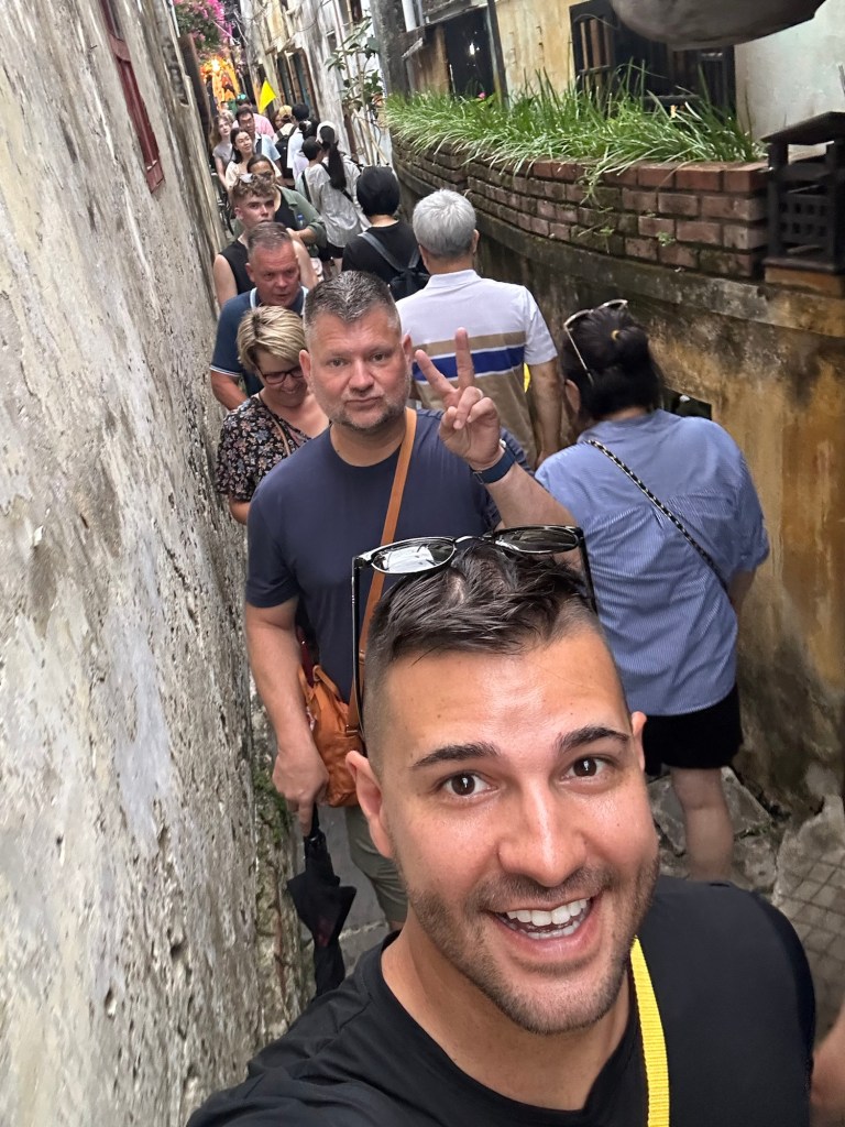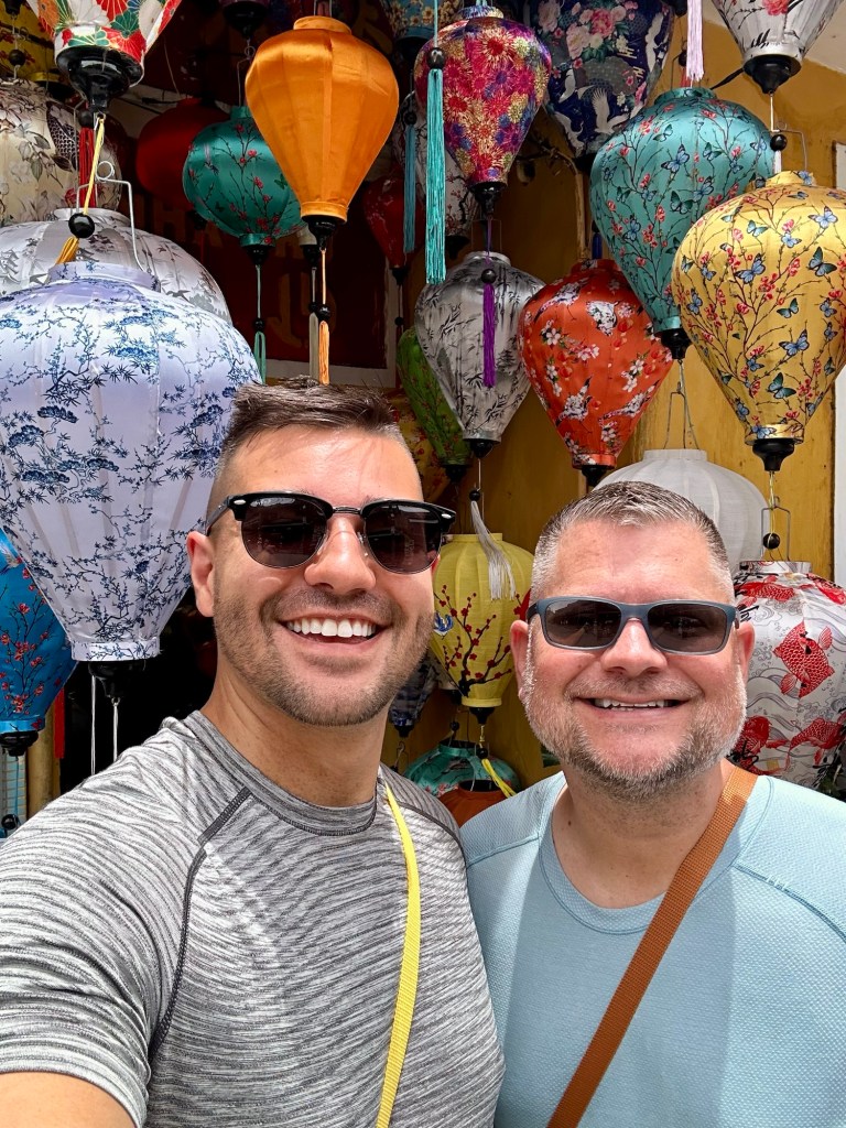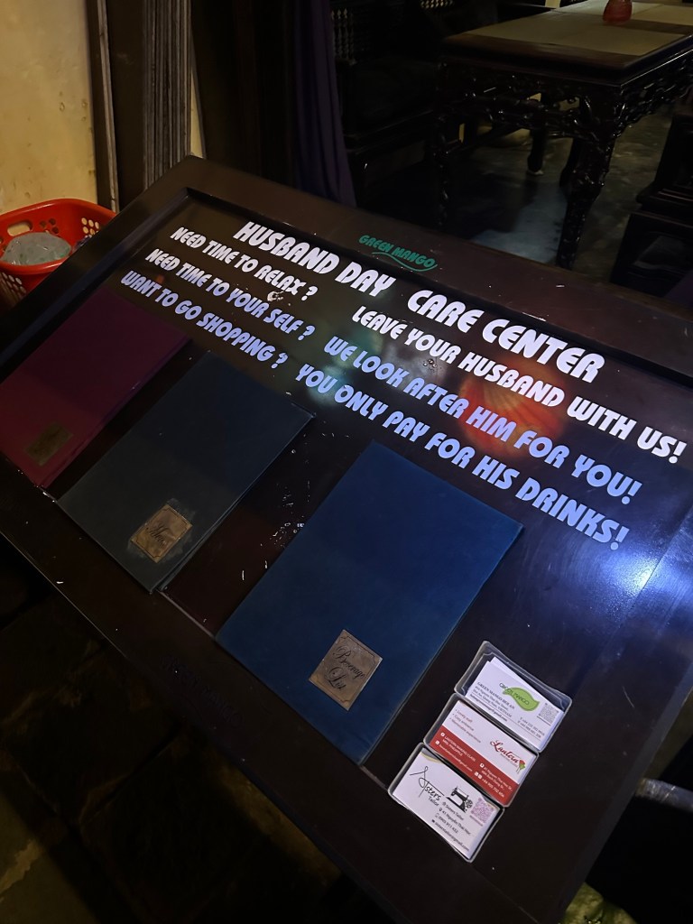 Hai pointed out a few notable places to spend time in the next two days, which we did, such as the Japanese Covered Bridge, Tan Ky Heritage House, a Chinese Assembly Hall, and others. Since it was passing 5:30 PM, most of these UNESCO sites were closing, and Hai steered our attention instead to two of her favorite shops — Toto Leather and Blue Chic Tailors. The first is where we met the owner, who demonstrated how to test for real leather, which is to burn it and smell it. If your nose picks up burning plastic, then run away from the shop as it should instead smell like BBQ. The goods available at Toto ranged from wallets, bags, and belts to duffles, briefcases, and any shoe you could dream up. We would definitely be back to Toto. Blue Chic Tailors was next and right across the street. The fourth-generation owner explained the shop while her staff cooled us down with ice-cold waters and local beer. The store is lined top to bottom with bolts of fabrics; silk, wool, cashmere, linen, tweed, and SO much more. They had mannequins dressed in finished pieces, and they were immaculately sculpted. Books with reference photos were provided, and they essentially said, ‘if you can dream it, we can sew it’. The majority of the group went to dreaming, with some starting that very moment with choosing fabrics and getting measurements. Since Jeff and I needed more time to think, we opted instead to meet Puna and Hai at a bar to further cool down with cocktails. We dreamed over those cocktails and planned to return first thing in the morning when the shop opened at 8:30 AM. To our surprise, they said if we were the first ones in, they would give 10% off everything and have the pieces ready later that afternoon for our first fitting…just wild with their speed.