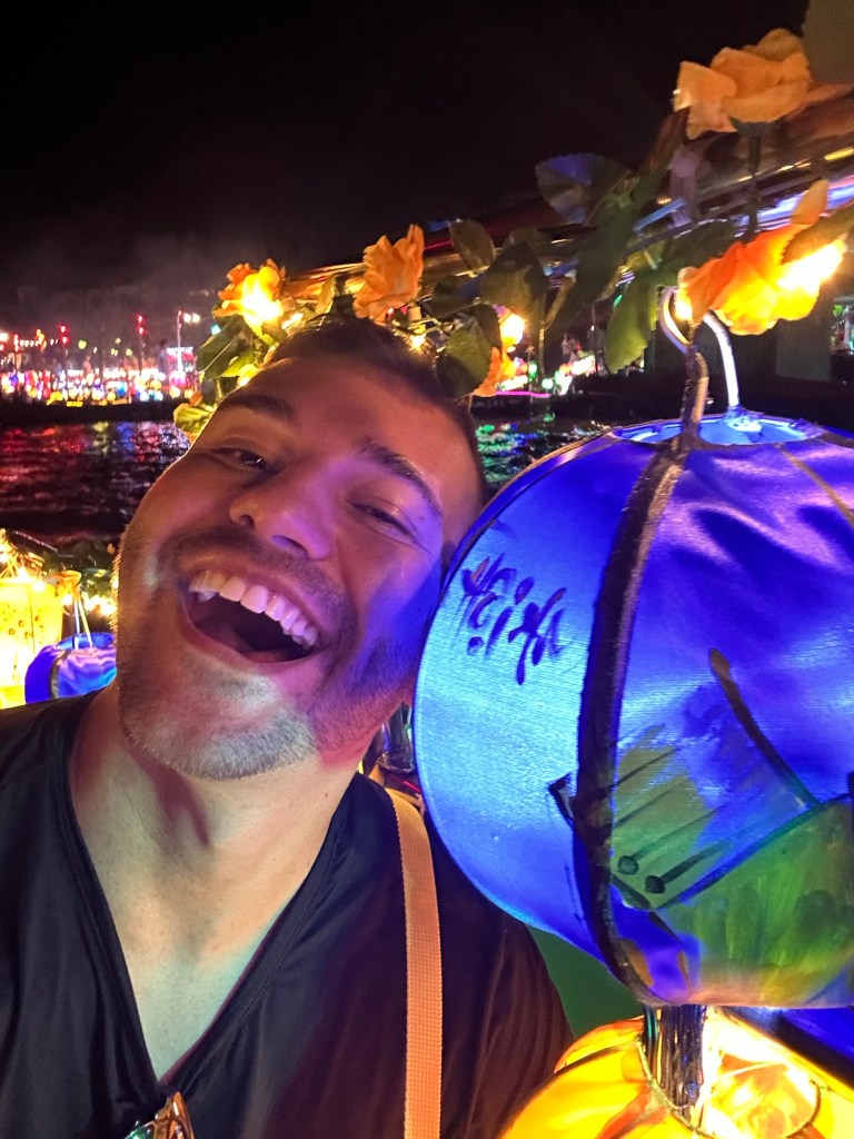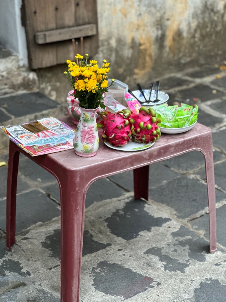 After dinner concluded, a group of us poured onto the busy riverside street and were immediately bombarded with offers to get us on a lantern boat. Our newest group member, Krissy, who lives in London but is an Aussie, had this on her bucket list. Louise haggled the price down from 150,000 dong to 70,000 dong per person, which included the floating wishing candle basket for each of us. The driver navigated down the Hoai River as we passed lantern-lit boat after boat. As we made our way near one of the major bridges, the floating wishes started to flicker among the waves. The driver cut the motor, lit the candles, and we began the process of one-by-one dipping our baskets into the waters as you’ll see in the video below. It was a fun experience that was made even more special as it was a full moon. Because of the lunar night, it was packed to the gills with people making wishes, both on the water and on land. As we learned later from Hai, the shop owners would also mark the lunar night by placing an offering outside and also burning paper to provide ash.