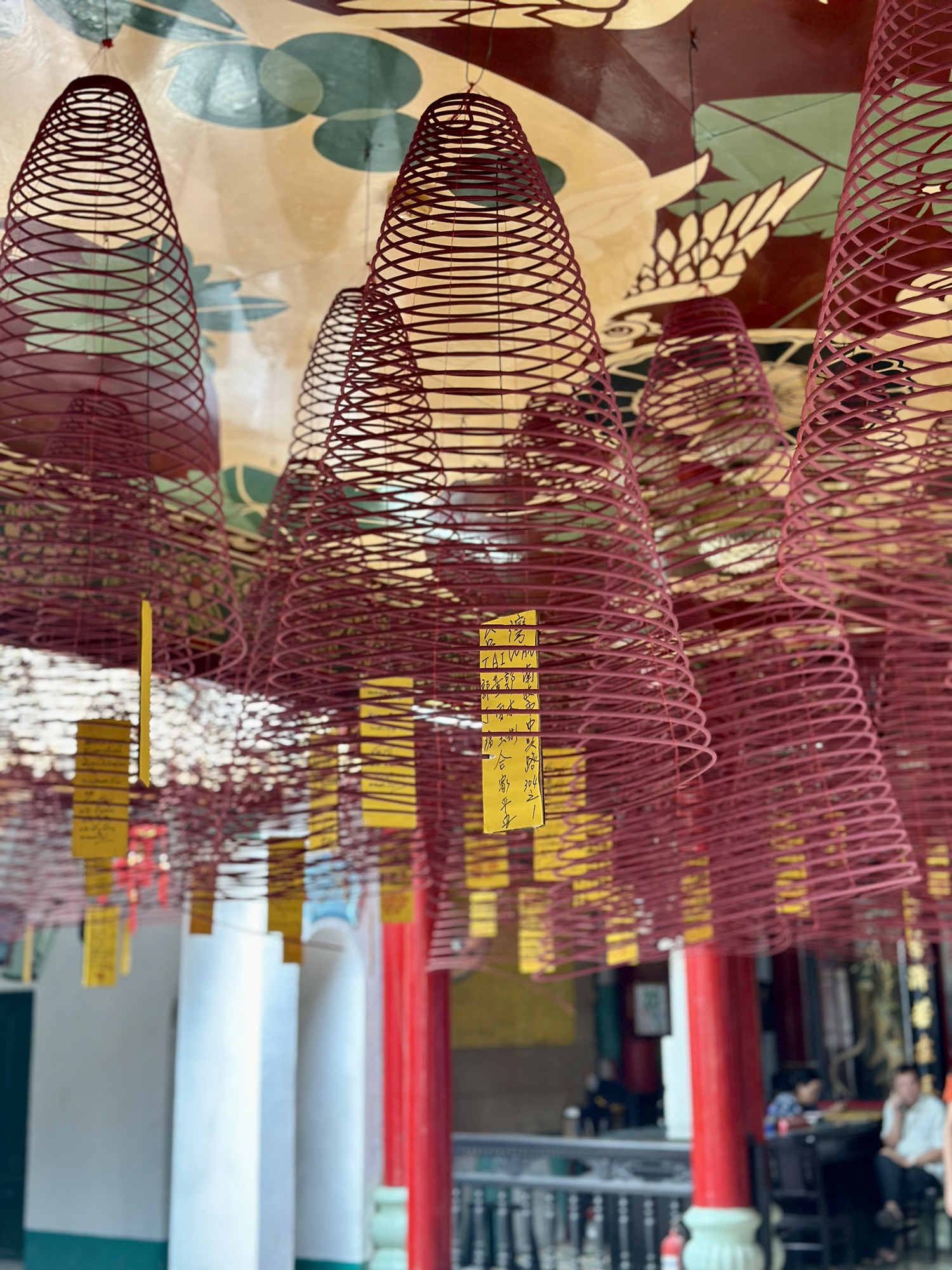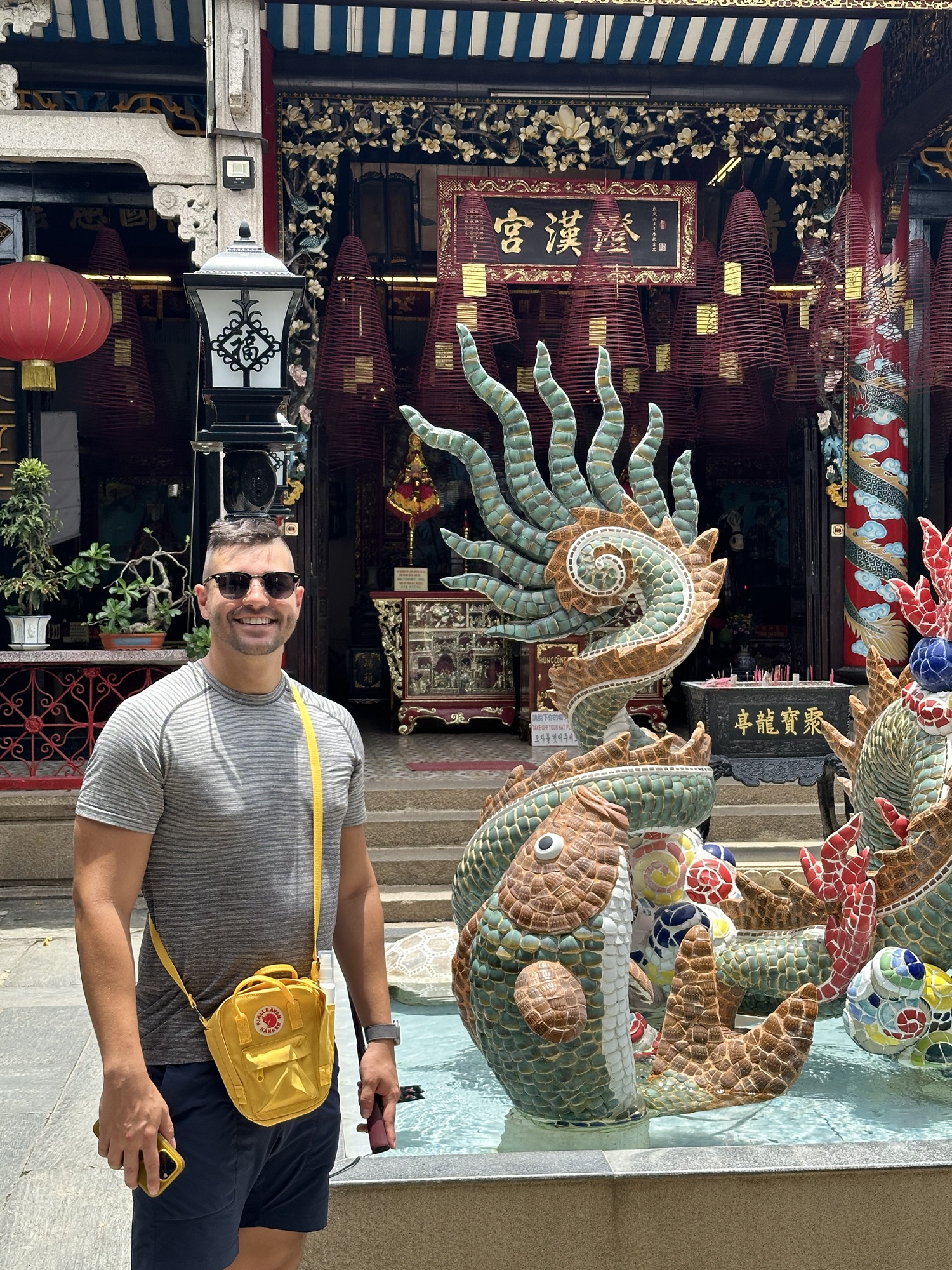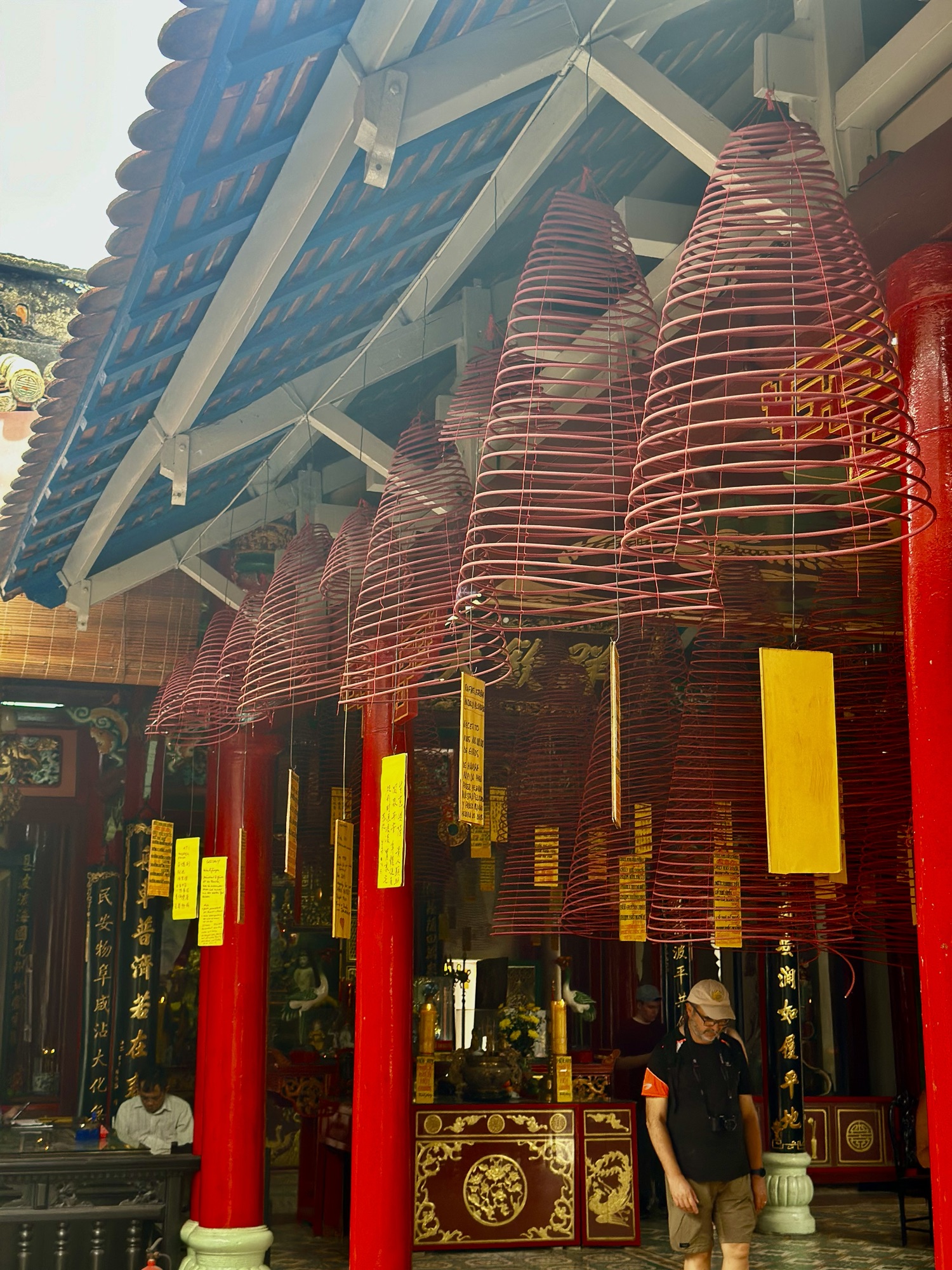Hoi An’s Ancient Town is a melting pot of cultures due to its history as a major port trading hub in Vietnam. The town has seen Japanese, Chinese, French, and Vietnamese influences, some of which still thrive today. Although the Japanese Covered Bridge was under construction, we were able to visit two stunning Chinese Assembly Halls. Hai, our guide, had explained that these halls serve both as meeting places and places of worship. We were greeted with the usual offerings of incense, cakes, and candles, but what stood out were the conical incense coils hanging above us. These coils burn for an entire month, with one ring representing each day, and inside them hang yellow tags inscribed with wishes. The fragrance of incense permeated every corner of the halls, even wafting into the lush gardens outside. The gardens were filled with tropical plants, bonsai, and intricate sculptures made from broken porcelain pieces. The walls were adorned with colorful reliefs preserved by ancient glazing techniques, sometimes involving more than five coats of paint and glaze to protect their color and luster.
