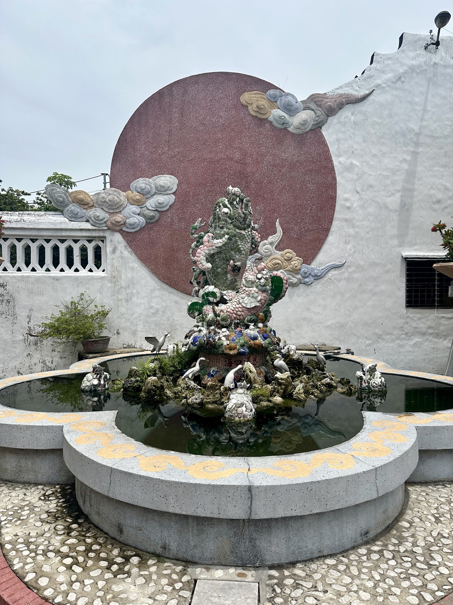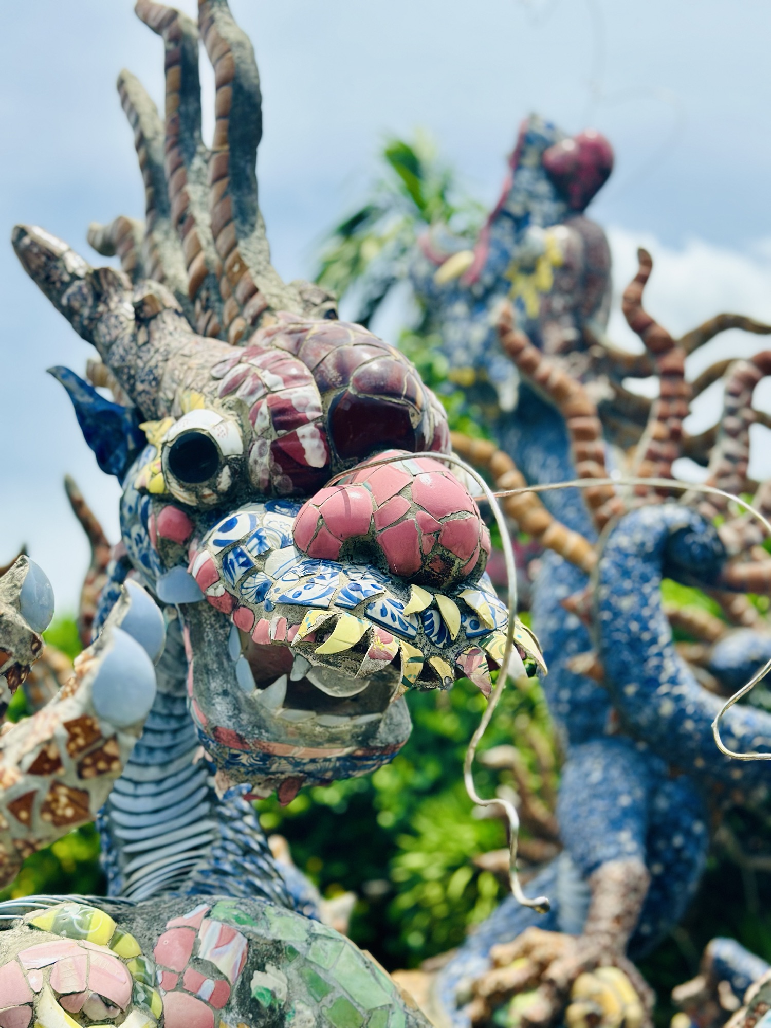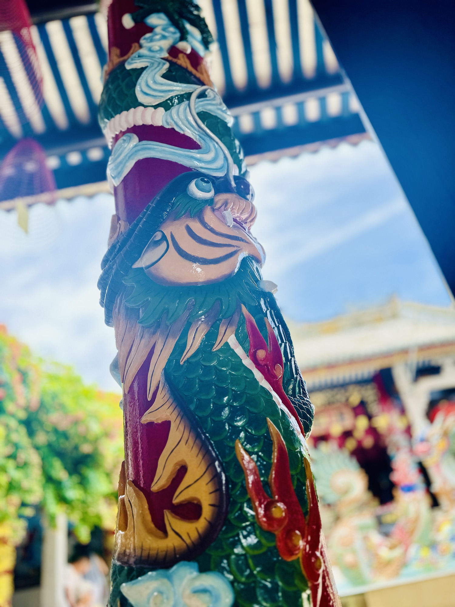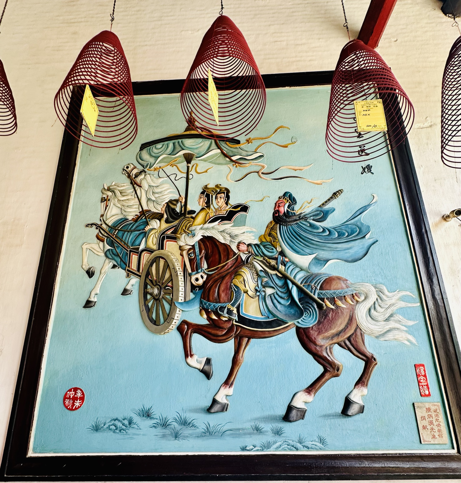 Hoi An’s Ancient Town is a melting pot of cultures due to its history as a major port trading hub in Vietnam. The town has seen Japanese, Chinese, French, and Vietnamese influences, some of which still thrive today. Although the Japanese Covered Bridge was under construction, we were able to visit two stunning Chinese Assembly Halls. Hai, our guide, had explained that these halls serve both as meeting places and places of worship. We were greeted with the usual offerings of incense, cakes, and candles, but what stood out were the conical incense coils hanging above us. These coils burn for an entire month, with one ring representing each day, and inside them hang yellow tags inscribed with wishes. The fragrance of incense permeated every corner of the halls, even wafting into the lush gardens outside. The gardens were filled with tropical plants, bonsai, and intricate sculptures made from broken porcelain pieces. The walls were adorned with colorful reliefs preserved by ancient glazing techniques, sometimes involving more than five coats of paint and glaze to protect their color and luster.