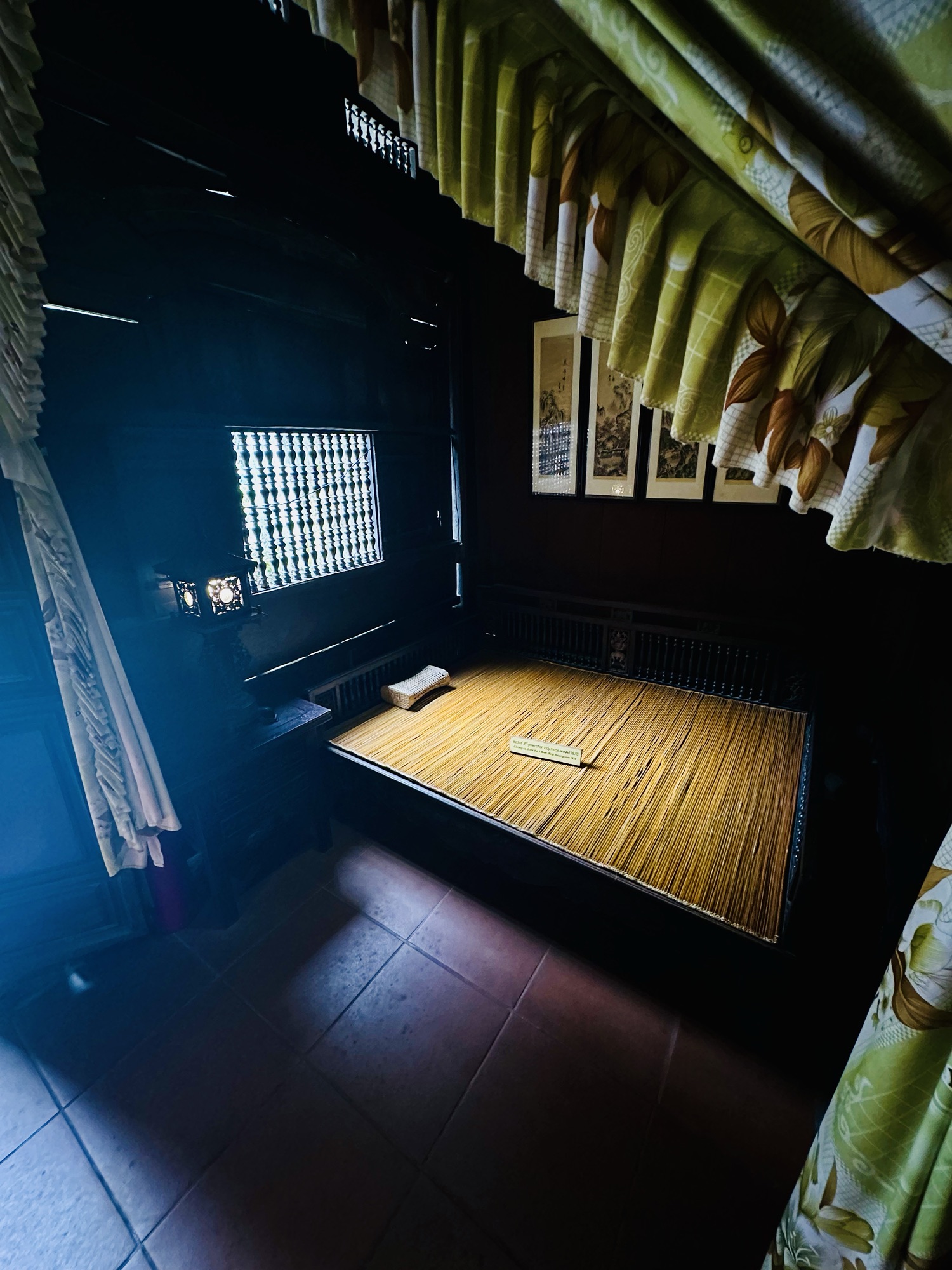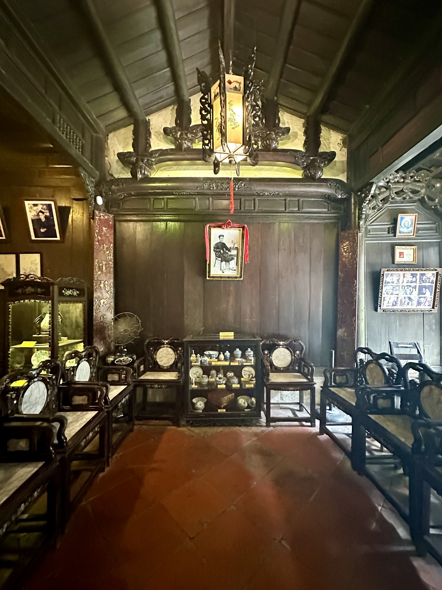 Leaving the assembly halls, we made our way to Tan Ky, a well-preserved wooden house built in the 18th century and still inhabited by the seventh generation of the original family. Despite numerous changes in Ancient Town, Tan Ky has maintained its originality and withstood the forces of nature. Inside, we saw various artifacts, including solid wooden tables and chairs, some too fragile to sit on. Wooden cases displayed bowls, silver, jade, and other heirlooms. The original pulley system, used to hoist goods from the first floor to the second, still functions today. The second floor was off-limits as the family still resides there. One of the most interesting artifacts was the Confucius Cup, designed 400-500 years ago to teach moderation; it stays full when filled to 80%, but overfilling causes it to empty completely. I forgot to get a video but you can see the cup in action here.