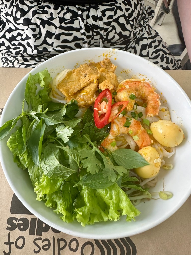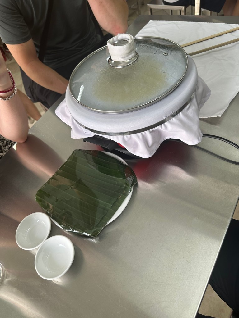 We learned about the various noodles of Vietnam and watched a demonstration on making rice batter from a specific rice grain mixed with water. This batter forms the base for many noodles in Vietnam. We then took our own rice batter and made Banh Vo’t, a rice noodle pancake, which we then turned into Banh Dap, or smash bread, by folding a toasted Banh Vo’t over a steamed one and smashing it. The students then prepared Mi Quang, a dish with pork, prawns, and quail eggs, while Jeff had a tofu and vegetable version.