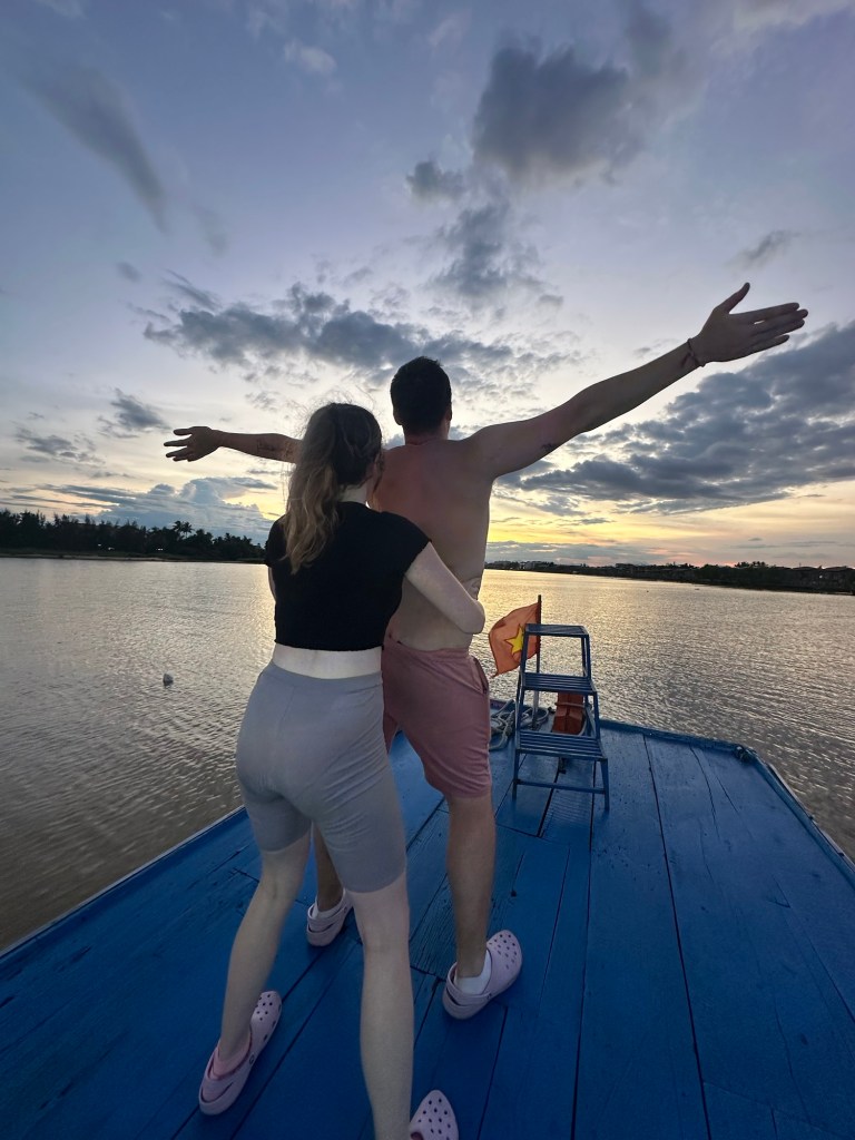 Back on land, we ended the journey on a boat that took us back up the river to Hoi An’s Ancient Town. We got to watch the sunset crack through the sky and snap photos — even a silly Titantic pose. Hai turned on tunes for us as well, which we quickly began to belt down the river. It was great to see the lanterns and wishes as we made our way back up the river.