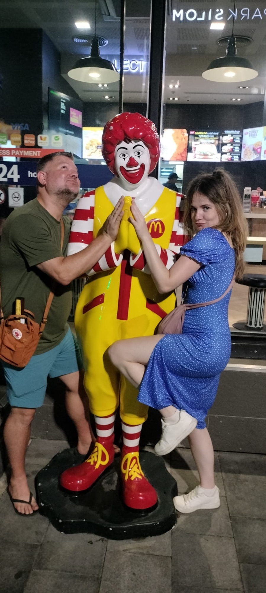 As the group dwindled, those of us staying in Bangkok for additional nights decided to visit Khaosan Road. Known for its street market, vibrant cocktail bars and clubs, as well as performers and food stalls, it was quite the scene. However, it wasn’t exactly what we wanted to wind down our night, so we skipped over to Silom to show our Australian and Irish friends the gayborhood. The drag performances were exceptional, with many queens dressed to the nines while they lip-synced and death-dropped, driving the crowd wild. We had a blast and ended up closing down the bar at 1am. In our drunken state, we thought McDonald’s was a great idea and ordered a ton of food; check out the photo of Ronald with Jeff and LouLou.