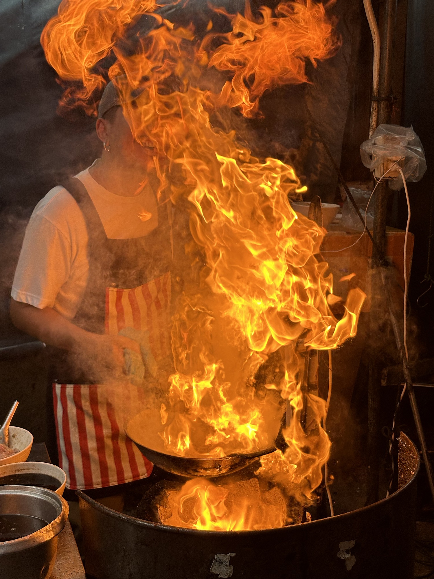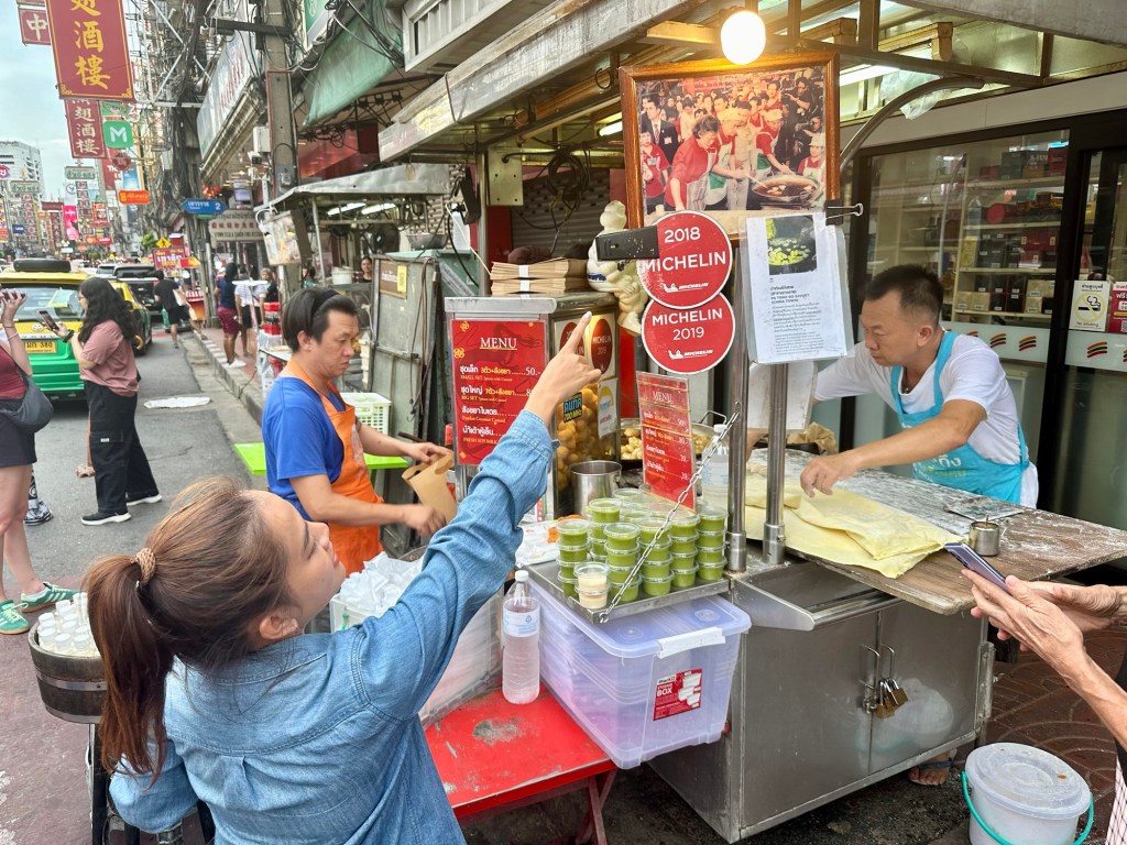 Our first stop was a Michelin-recommended street vendor that specializes in fried dough, which is meant to be dipped into a delicious pandan custard. Puna explained that while this is considered a dessert, Thai people often eat it as a breakfast item—something I could definitely get used to back in the States. Our second stop took us further into Chinatown to another Michelin Bib Gourmand, Guay Tiew Kua Gai Suanmali. This family-owned stall serves a hallmark dish of crispy fried noodles tossed with your choice of meat and egg. I opted for pork while Jeff chose chicken; both were incredibly juicy, crispy, and seasoned to perfection. Since Puna knows the owners, we got a tour of the outdoor kitchen where all the action happens. Kudos to Jeff for capturing the amazing photo below of the wok engulfed in flames.
