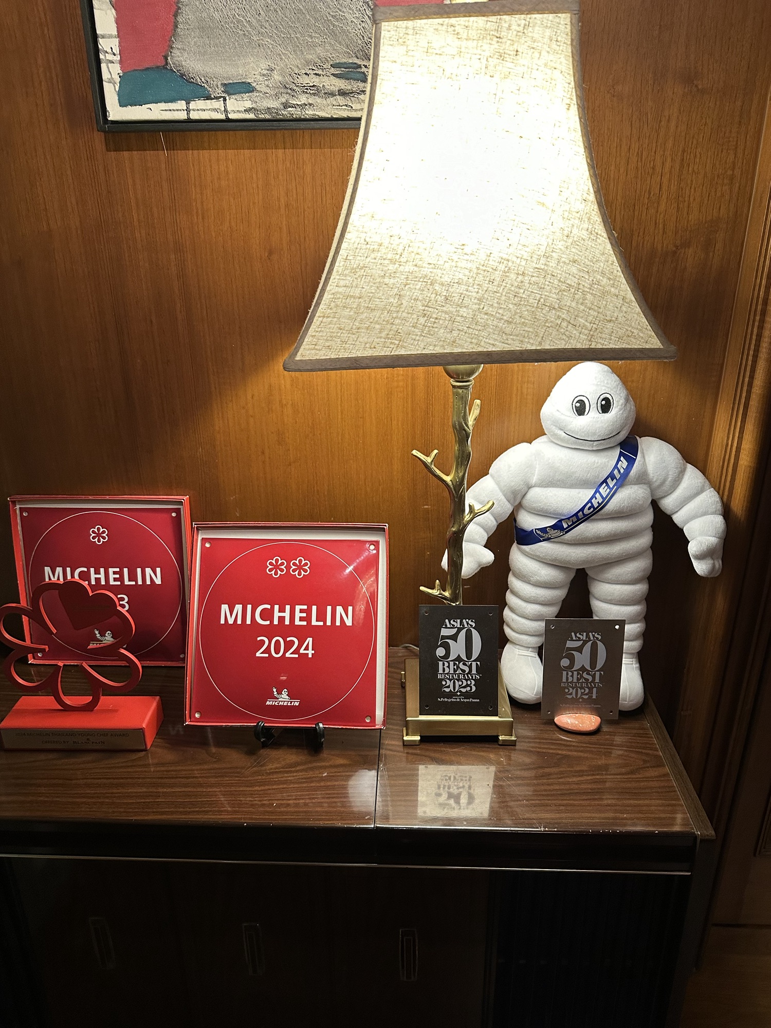 The entryway at Baan Tepa showing off the Michelin and Asia’s 50 Best Restaurant recognitions they have received in the last two years — also, do I need a cute Michelin Man plush?!