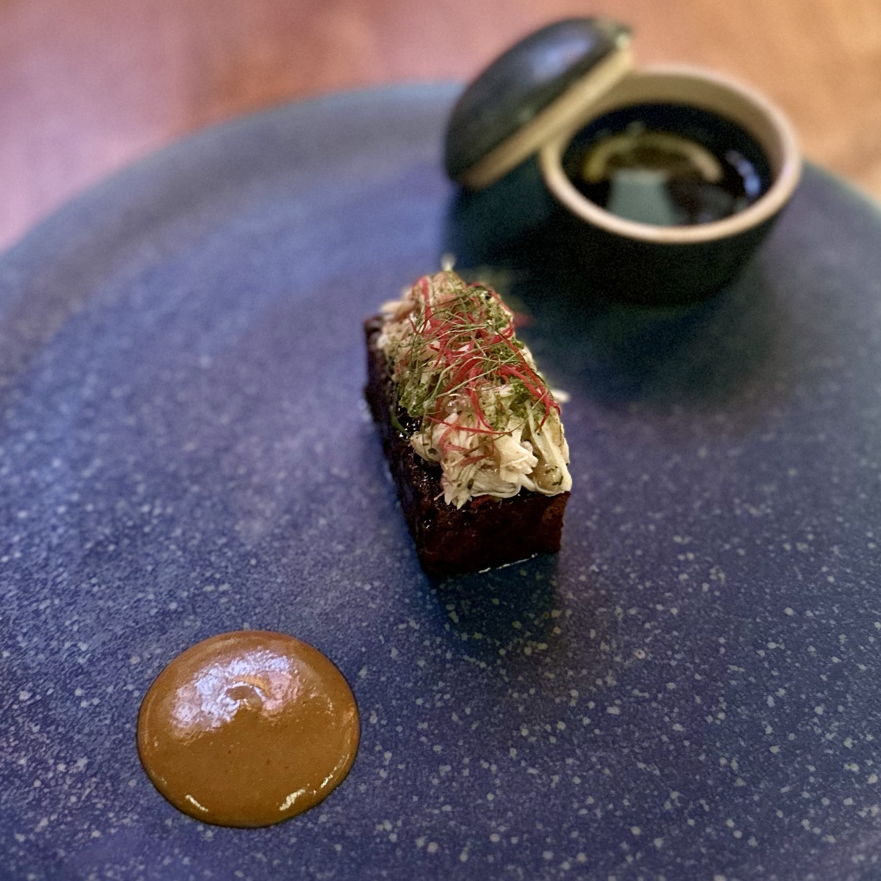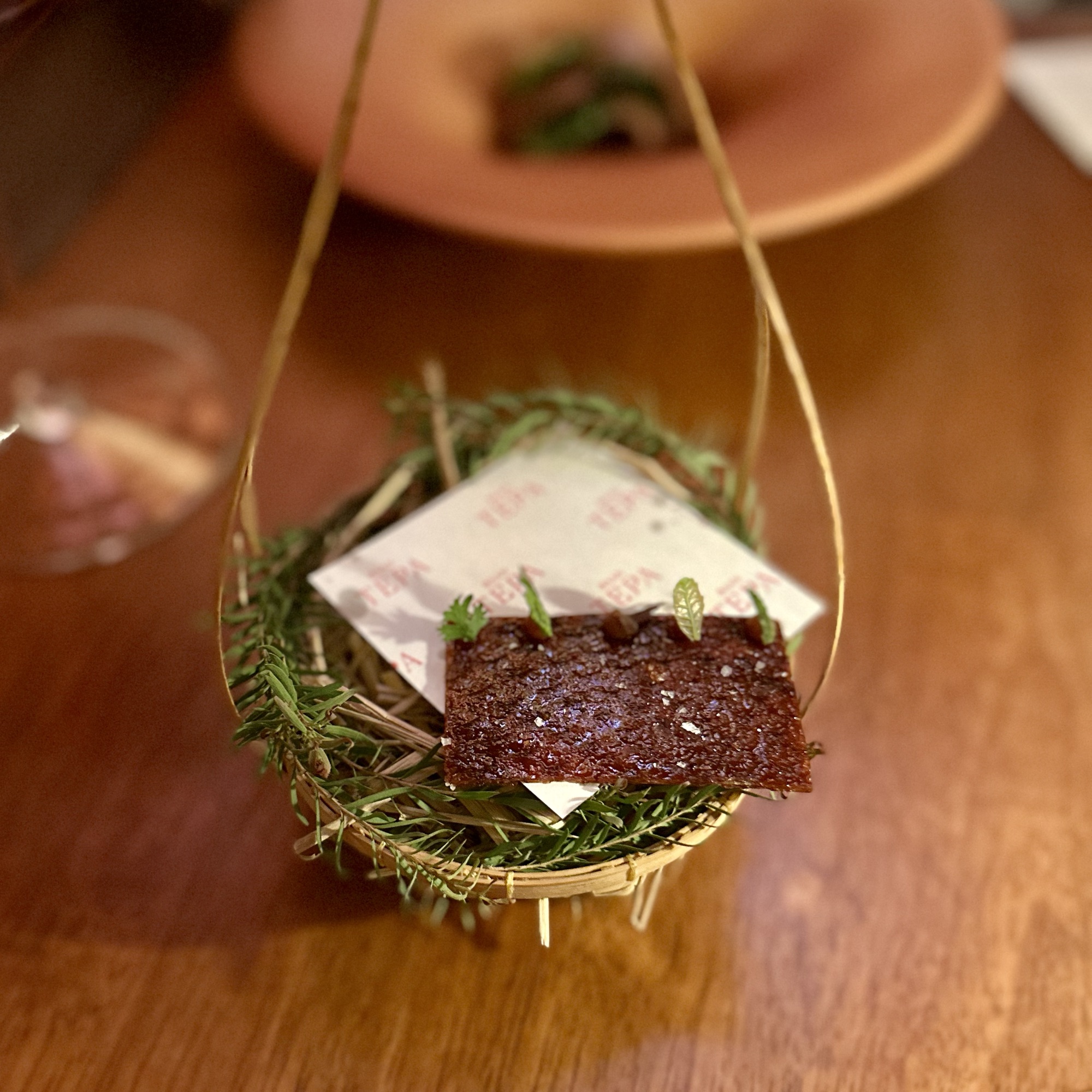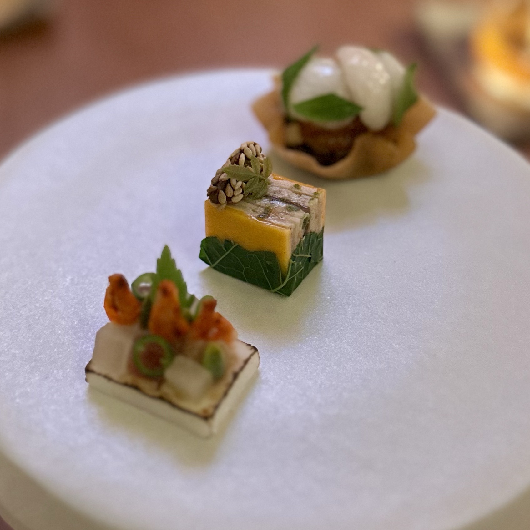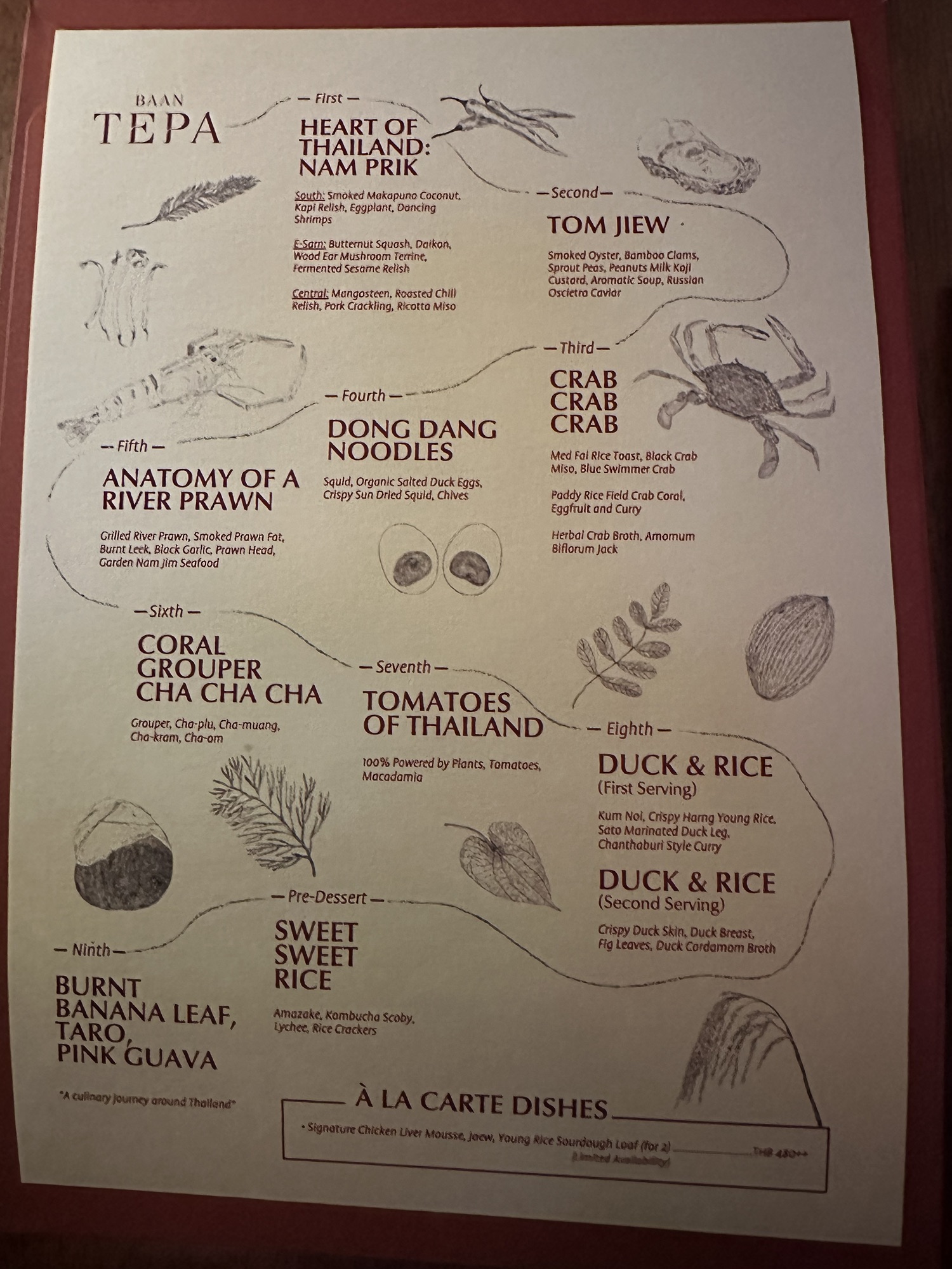Of the dishes, my top three favorites were the Anatomy of a River Prawn, Tomatoes of Thailand, and the Dong Dang Noodles. River prawns are renowned in Thailand for their huge size and delightful taste. It was amazing to see how Baan Tepa recreated a prawn body using the head as a vessel for a spicy shrimp head sauce, the body as the actual prawn, and the tail as orange crackers with black garlic paste. The Tomatoes of Thailand dish was probably the best tomatoes we’ve ever had. And for me, the Dong Dang Noodles had a perfect chew, great flavor of spice without too much heat, and a delectable salted duck egg that paired incredibly well with the dried squid for flavor and crunch. But to be fair, every single dish at Baan Tepa was mind-blowing in flavor, style, innovation, and taste. The wine/sake pairings were also impeccably done to complement the food—some toned down the spice, others highlighted the herbs, and one balanced the sourness of a dish, making me appreciate the wine more with the dish than without.
