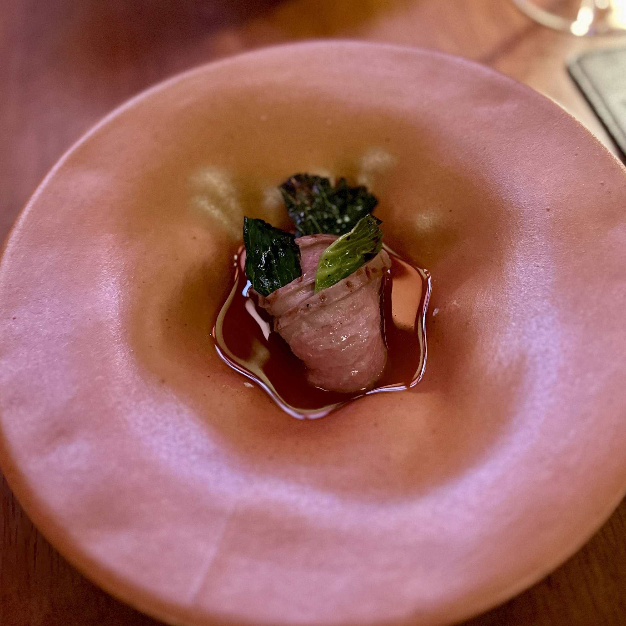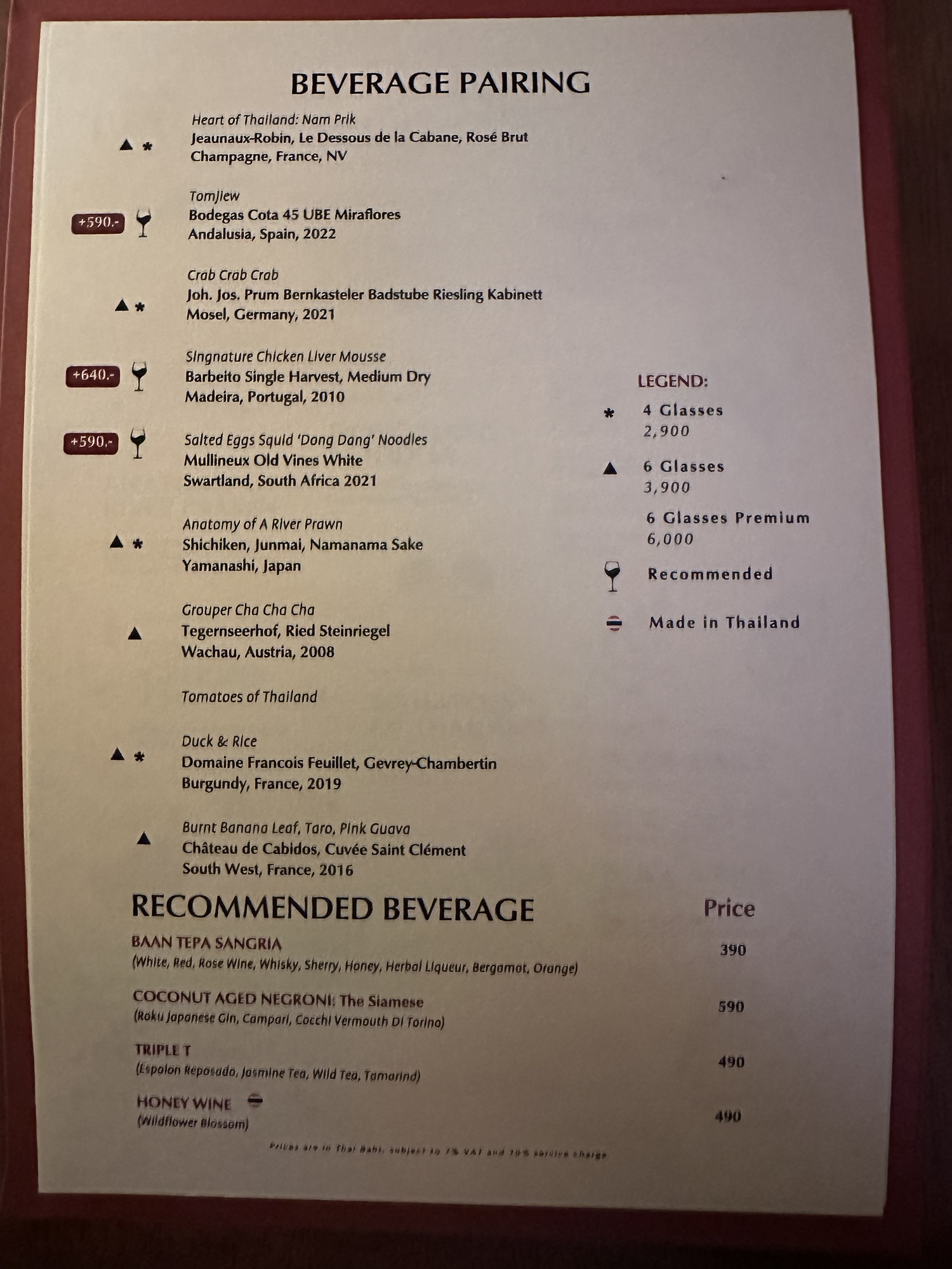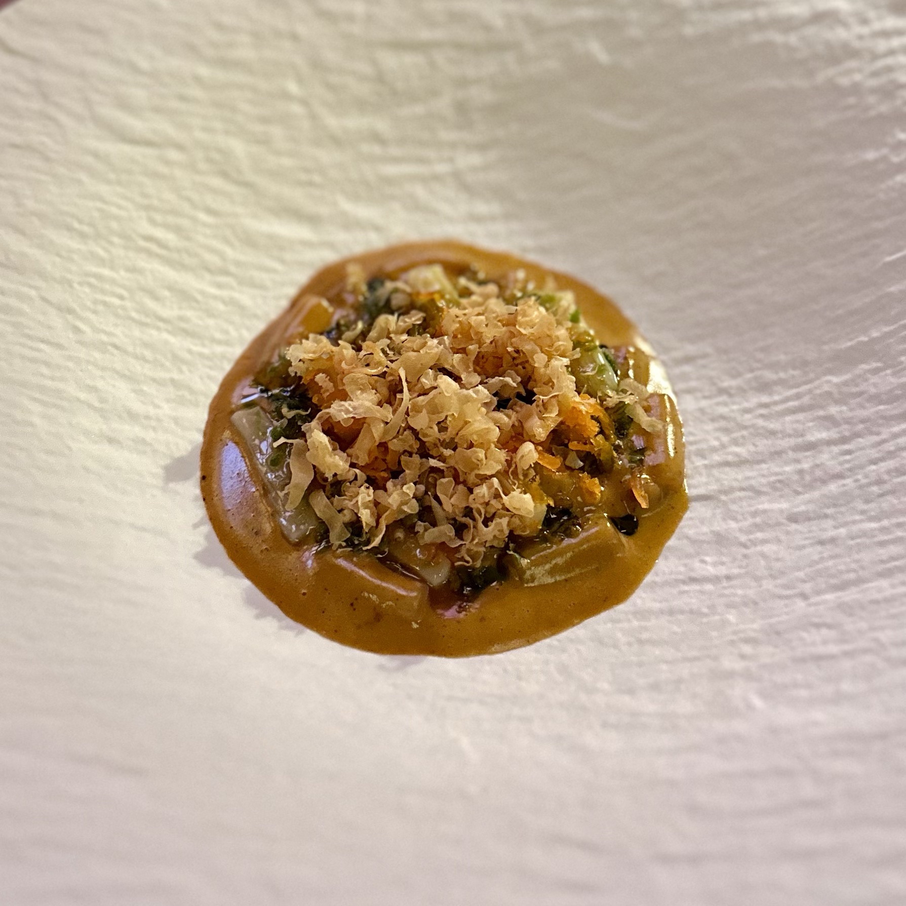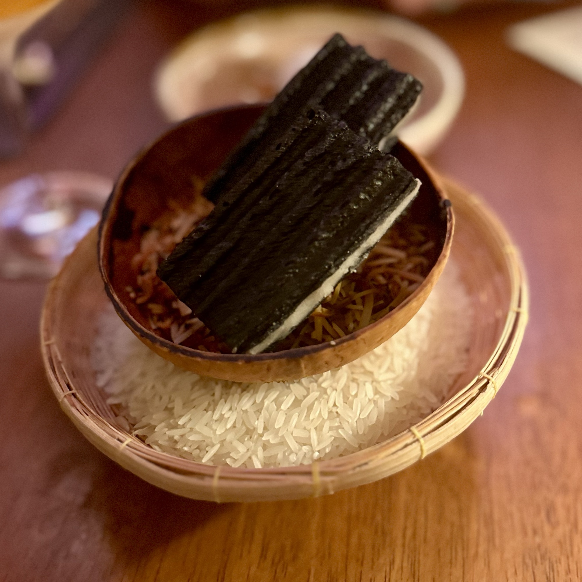 Of the dishes, my top three favorites were the Anatomy of a River Prawn, Tomatoes of Thailand, and the Dong Dang Noodles. River prawns are renowned in Thailand for their huge size and delightful taste. It was amazing to see how Baan Tepa recreated a prawn body using the head as a vessel for a spicy shrimp head sauce, the body as the actual prawn, and the tail as orange crackers with black garlic paste. The Tomatoes of Thailand dish was probably the best tomatoes we’ve ever had. And for me, the Dong Dang Noodles had a perfect chew, great flavor of spice without too much heat, and a delectable salted duck egg that paired incredibly well with the dried squid for flavor and crunch. But to be fair, every single dish at Baan Tepa was mind-blowing in flavor, style, innovation, and taste. The wine/sake pairings were also impeccably done to complement the food—some toned down the spice, others highlighted the herbs, and one balanced the sourness of a dish, making me appreciate the wine more with the dish than without.