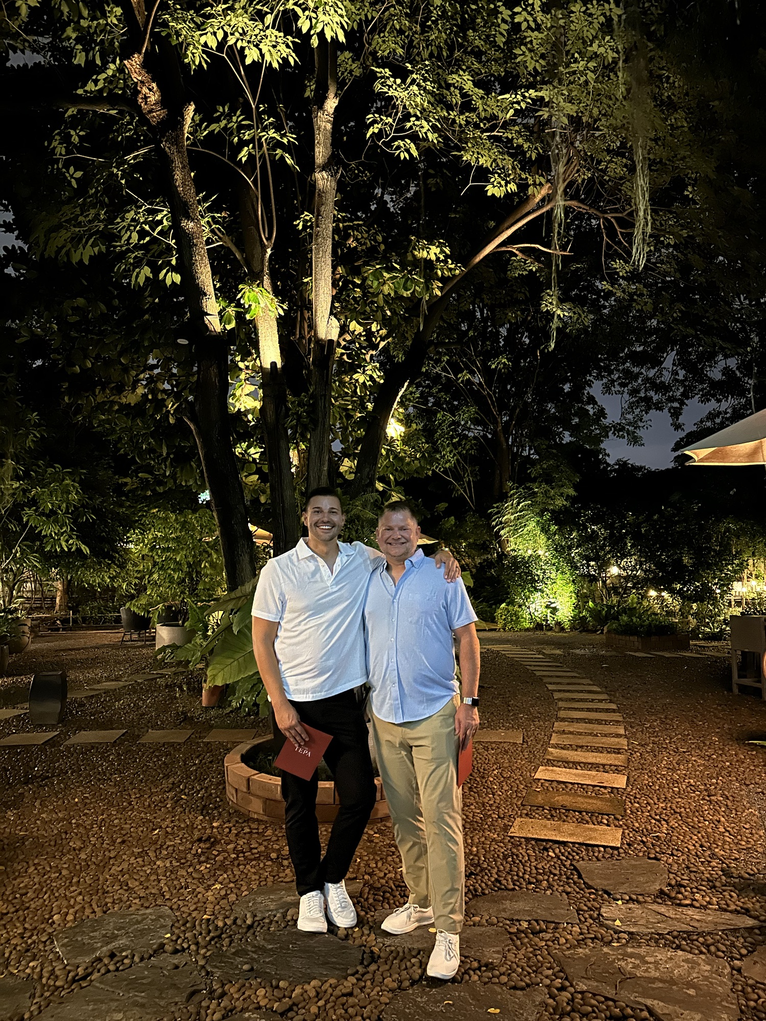 After four hours, we concluded our culinary journey and Baan Tepa staff member Noon took us on a tour of the two-story house filled with abstract art, beautiful images of Chef Tepa’s family, and ornamentals reflecting Thai heritage. The last part of the tour took us into their garden where we got to taste the herbs and greens used in our dishes. It was a fun game guessing the herb and which dishes they were in. Adjacent to the garden is an outdoor café and seating area where we got a photo to capture the night. We highly recommend Baan Tepa to anyone visiting Bangkok and looking for a culinary journey through modern and innovative Thai cuisine.