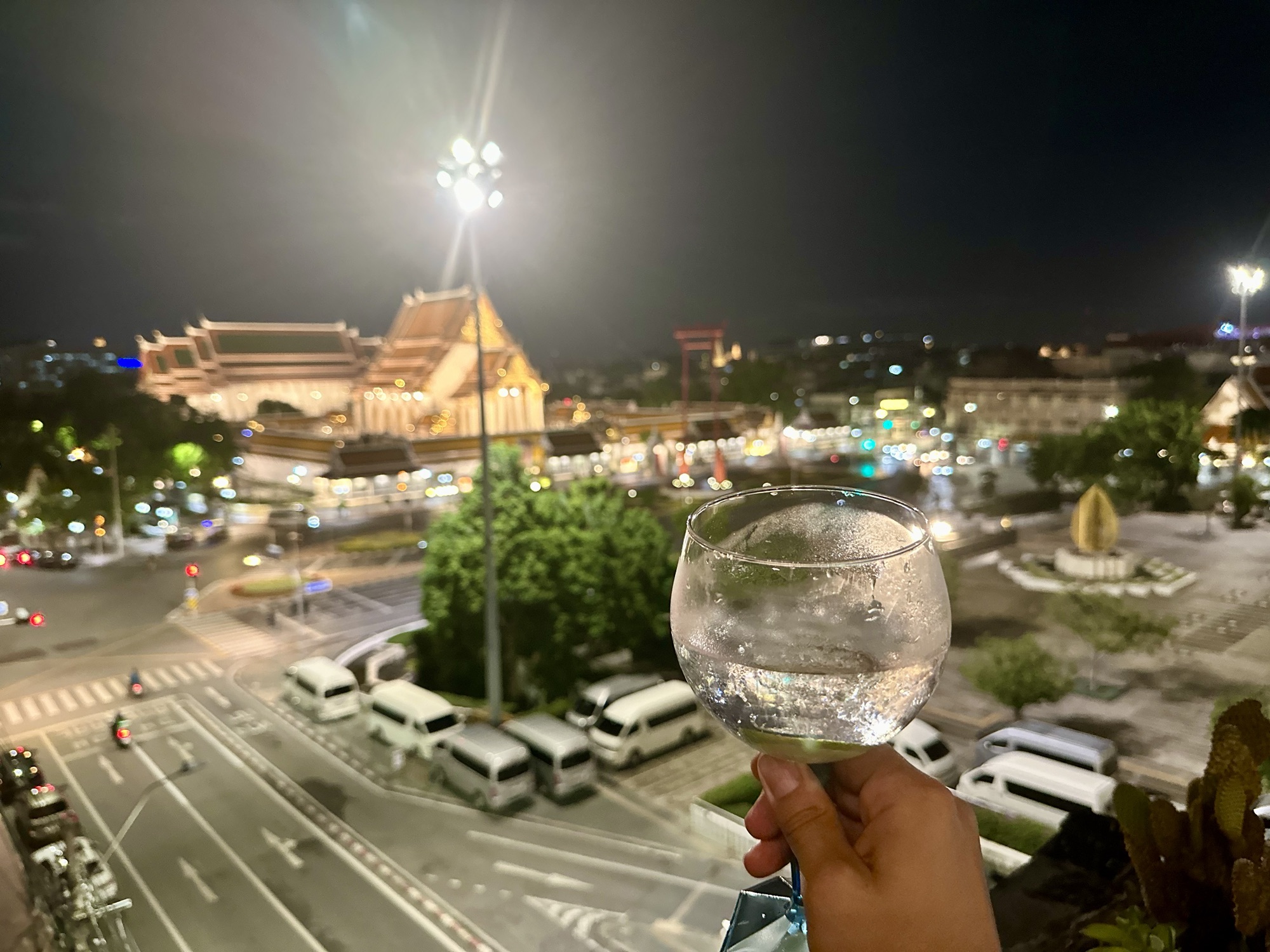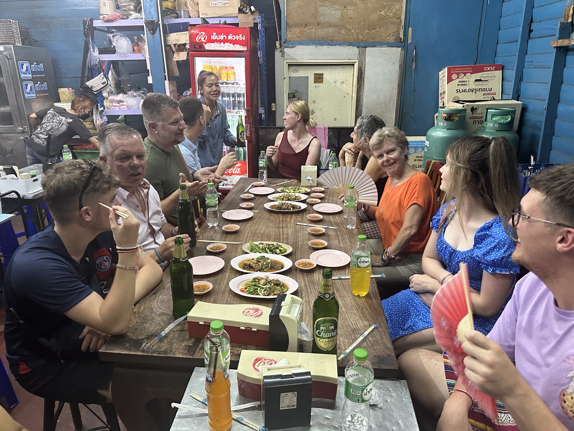 Our next stop featured another main dish with four different options. The first was fried morning glory with garlic, the second was chili-spiced sea bass, the third was Tom Kha Gai seafood soup, and the last was a crispy chicken dish. Each dish had typical Thai spice, albeit toned down thanks to Puna advising the kitchen that we were foreigners. Our last food stop before drinks was at a pad Thai shop known for its unique twist on this national dish. Instead of steamed noodles, they serve it on a bed of crispy noodles. By this point, I was so stuffed that I just nibbled bites off Jeff’s plate while enjoying a Chang beer (there’s always room for alcohol!). A short walk later, we arrived at Swing Bar, which overlooks a large swing (known as a gate) and an adjacent temple. It was here that the goodbyes began among the Sticky Rice Family we’ve come to adore. I definitely welled up saying goodbye to our new friends from Australia, Ireland, Great Britain, and Thailand. For those in the group reading this, expect a later post dedicated to you amazing humans—we can’t wait to stay in touch and hopefully visit your countries in the future! This also meant bidding farewell to Puna, our extraordinary tour guide whom we now consider our Thai sister. She made this trip so enjoyable, seamless, and fun—thank you, Puna!