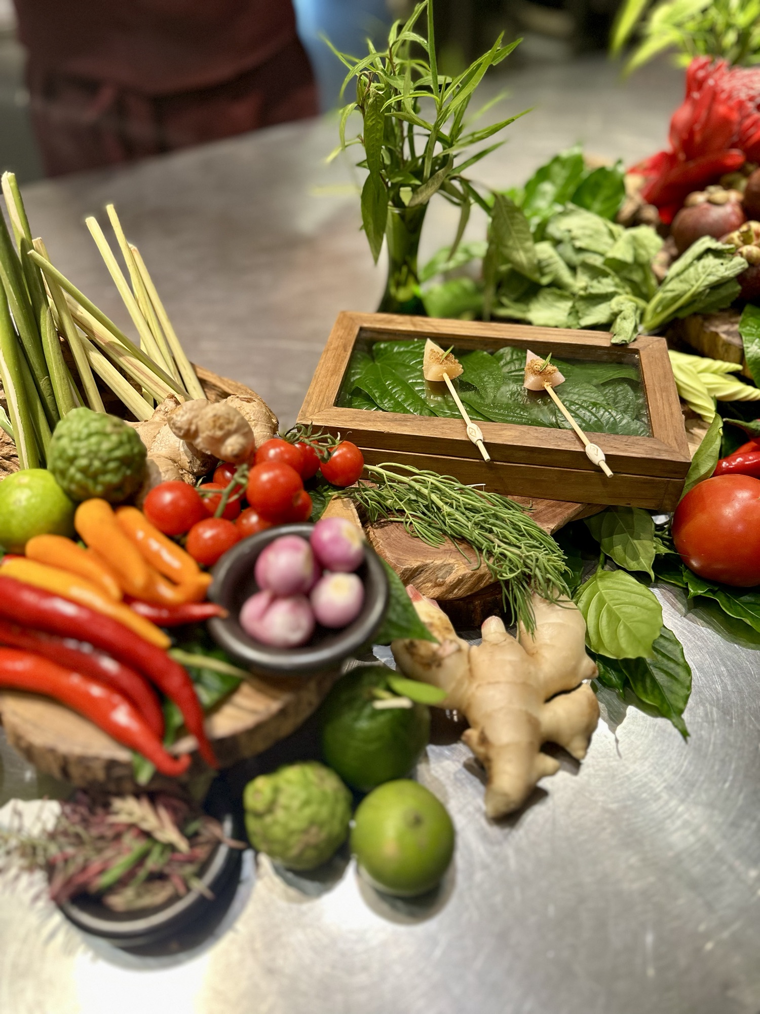 Baan Tepa was built in the 1980s, owned by Chef Tam’s grandmother, Lady Suwaree Debhakam, a home that has been in the family for 3 generations. The compound has now been converted into an urban food space with three key sections; Tepa Kitchen, Tepa Garden and house itself. One of the few female Thai chefs recognized by Michelin, Chef Tam Chudaree Debhakam crafts innovative cuisine that celebrates her country’s culinary heritage. We chose the nine-course option with beverage pairing known as the Baan Tepa Experience. You’ll see the menu with each course listed, and might notice it’s actually more than nine since there’s a “pre-dessert,” a course split into two servings, and an optional bread with chicken pate dish we added on. We started the evening with two signature cocktails that were well-balanced and went down too fast! Next was a tour of the incredible kitchen, followed by a fresh amuse-bouche made of local fruits and honey.